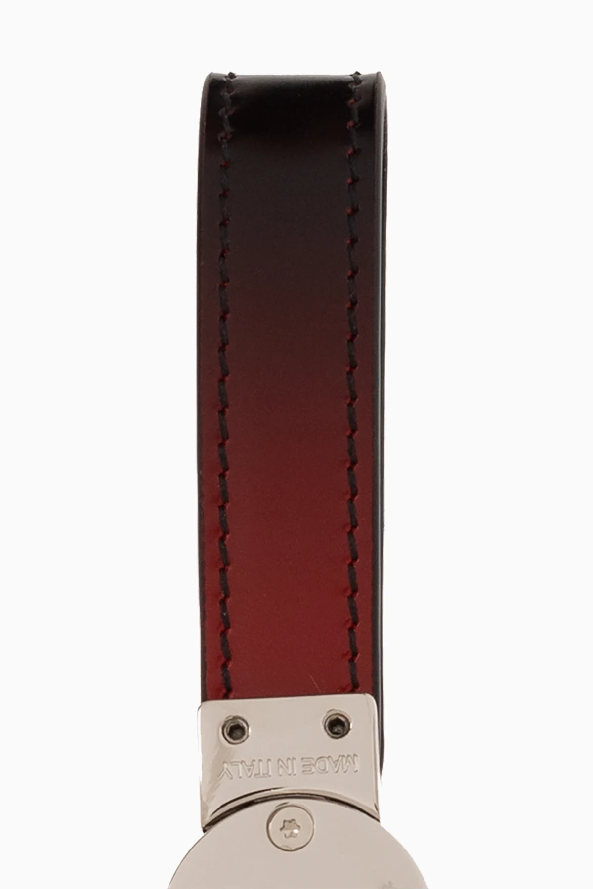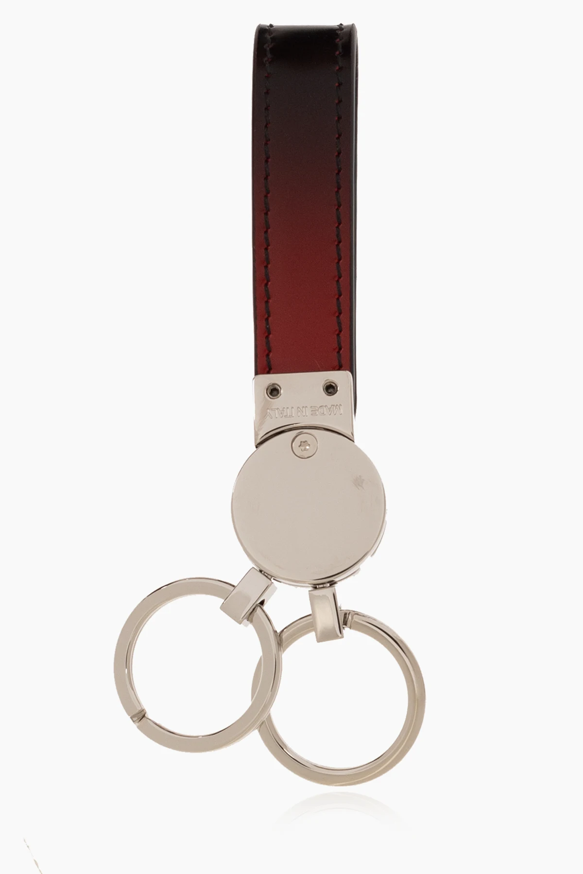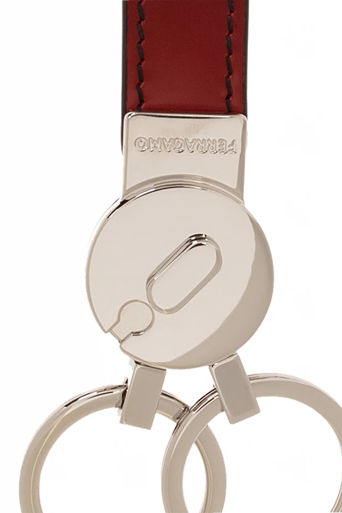 Brelok na klucze w kolorze czerwono-czarno-srebrnym FERRAGAMO. Wykonany ze skóry i metalu. Ozdobiony wygrawerowanym logo.