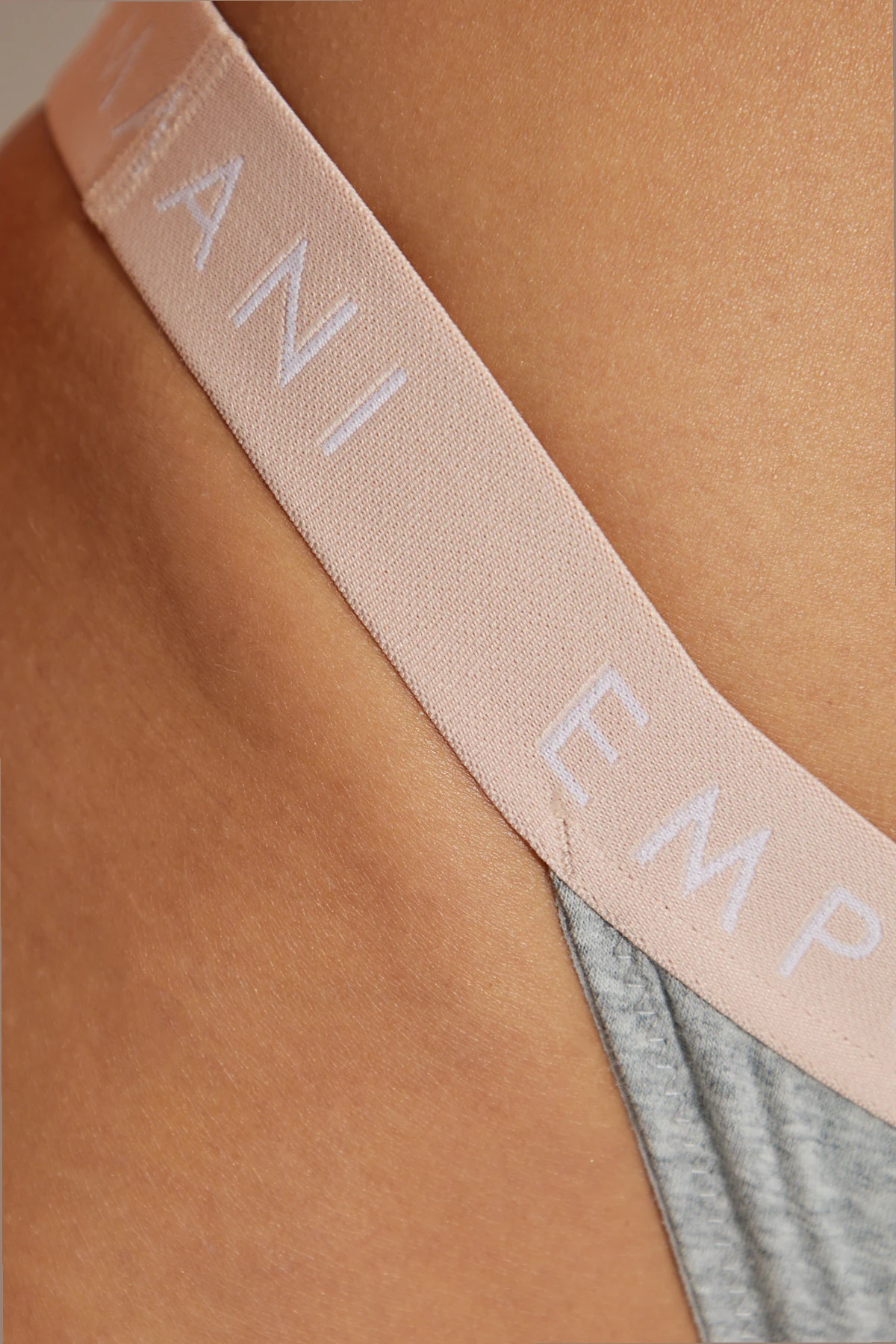 Klasyczny krój typu "thong" w kolorze szarym, z minimalistycznym pokryciem z tyłu, podkreśla elegancję i subtelność. Elastyczny pas biodrowy w jasnoróżowym kolorze zdobi biały napis "EMPORIO ARMANI", a logo marki w formie stylizowanego orła umieszczone pomiędzy słowami dodaje ekskluzywnego charakteru.