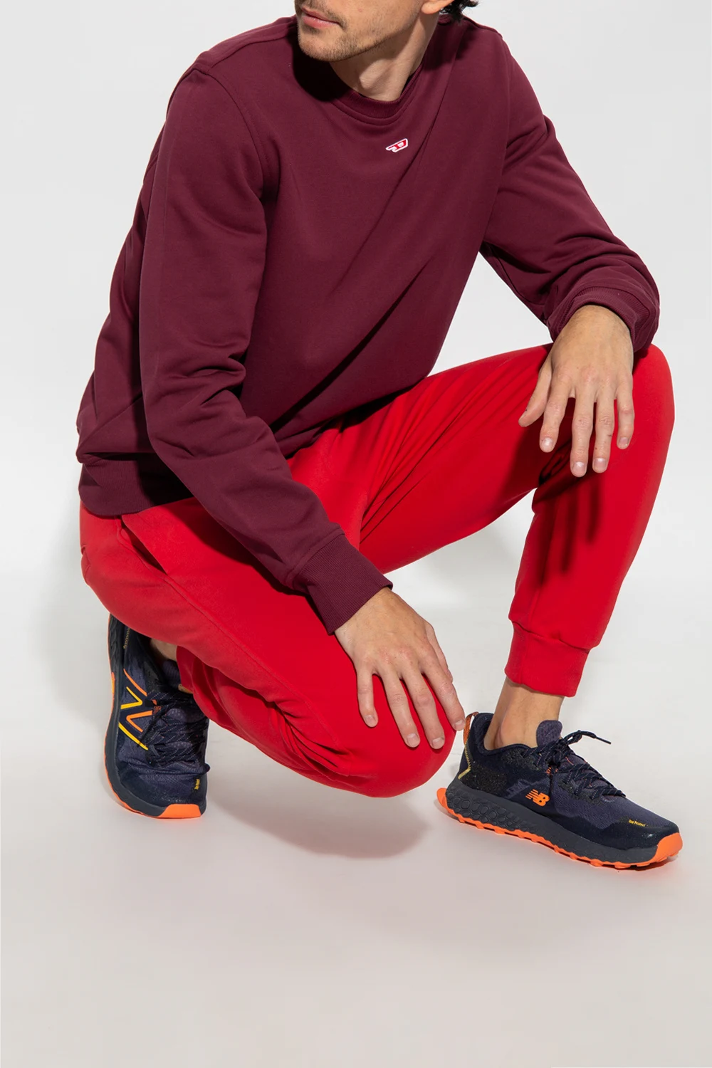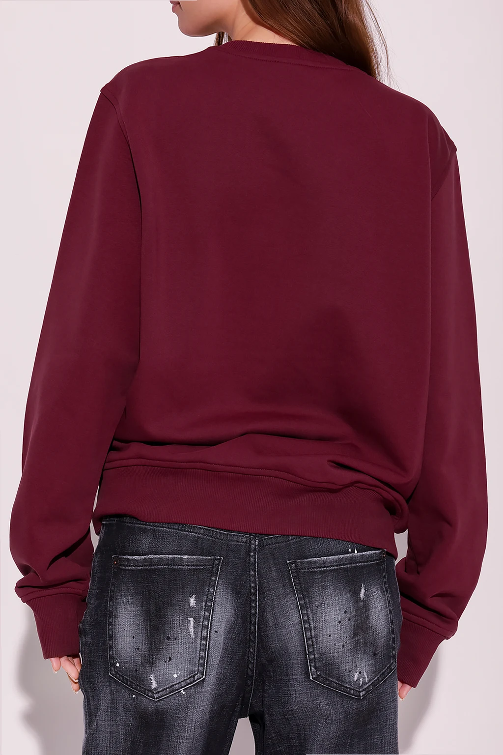 Bordowa bluza, model ‘S-GINN-D’ Diesel. Wykonana z bawełny. Ozdobiona naszywką z logo w kolorze biało-czerwonym. Okrągły dekolt, dół i długie rękawy wykończone ściągaczem.