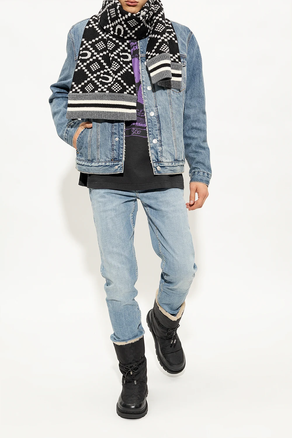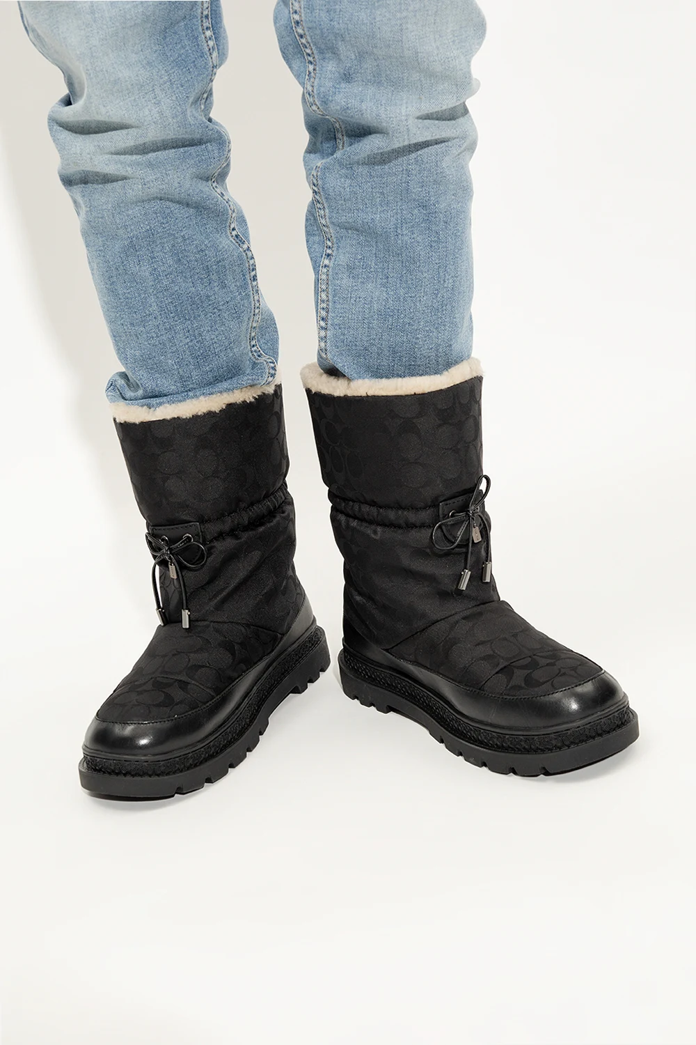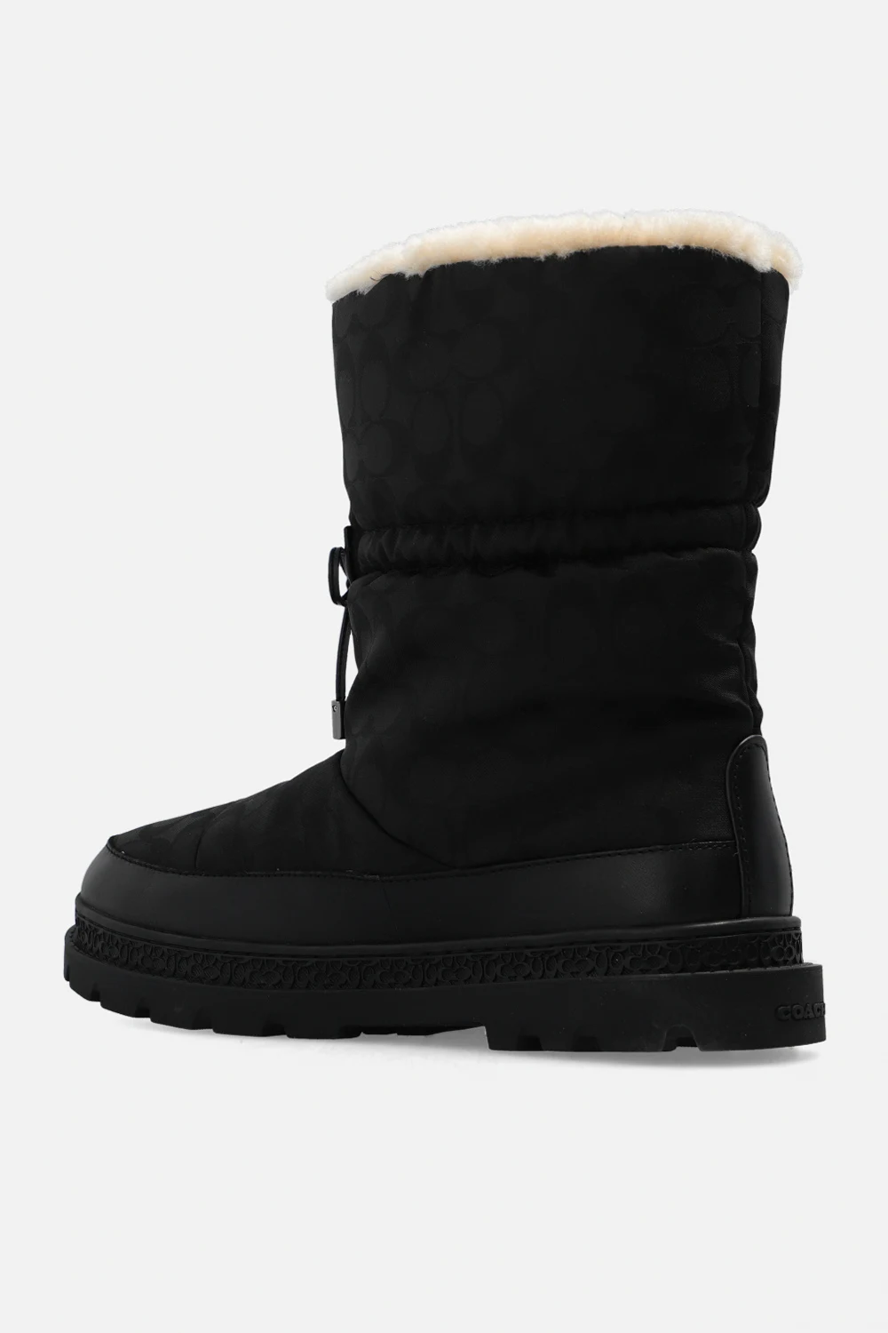 Czarne śniegowce Coach. Wykonane z materiału z recyklingu ozdobionego wzorem z monogramem. Wykończone skórą. Warstwa wewnętrzna wykończona kremowym futrem. Z przodu ściągane trokami. Czarna, gumowa podeszwa.