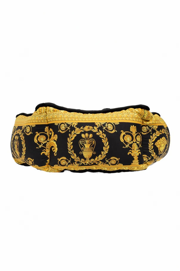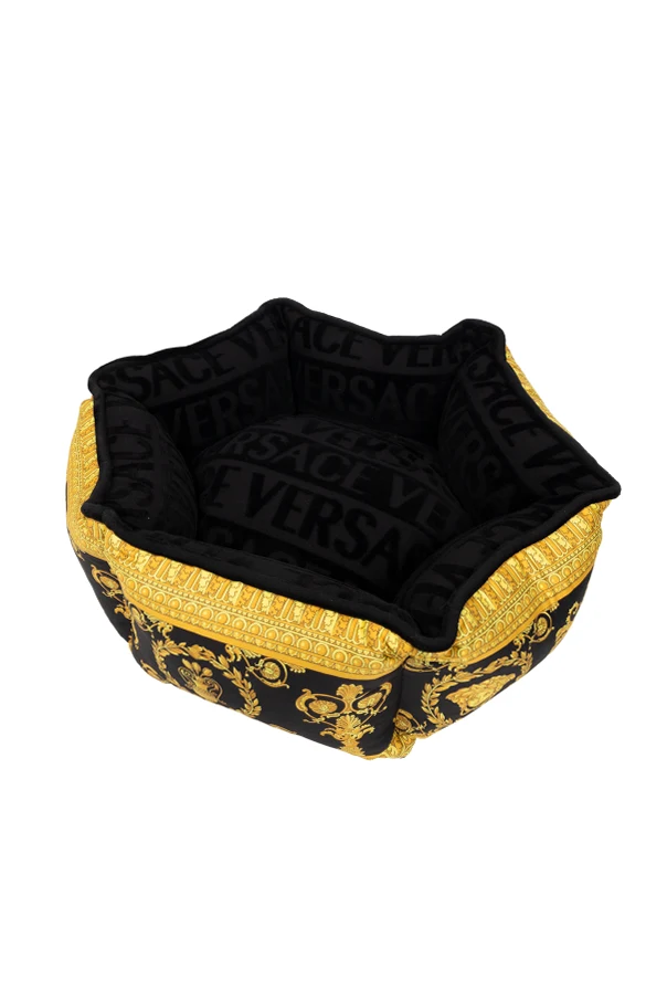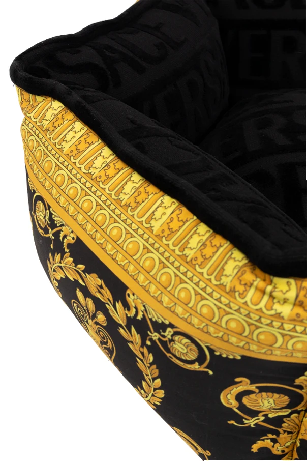 Legowisko charakteryzuje się przepięknym połączeniem czarno-złotej kolorystyki , gdzie wewnętrzna część zdobiona jest powtarzającym się napisem "VERSACE", tworzącym elegancki i rozpoznawalny wzór. Zewnętrzna strona legowiska przyciąga uwagę swoją złotą barwą z klasycznymi, barokowymi motywami – zwojami, liśćmi akantu oraz greckimi meandrami, które są sygnaturą marki. Centralne punkty zdobi logo Versace – Meduza, otoczona dekoracyjnym ornamentem, co podkreśla ekskluzywny charakter produktu.