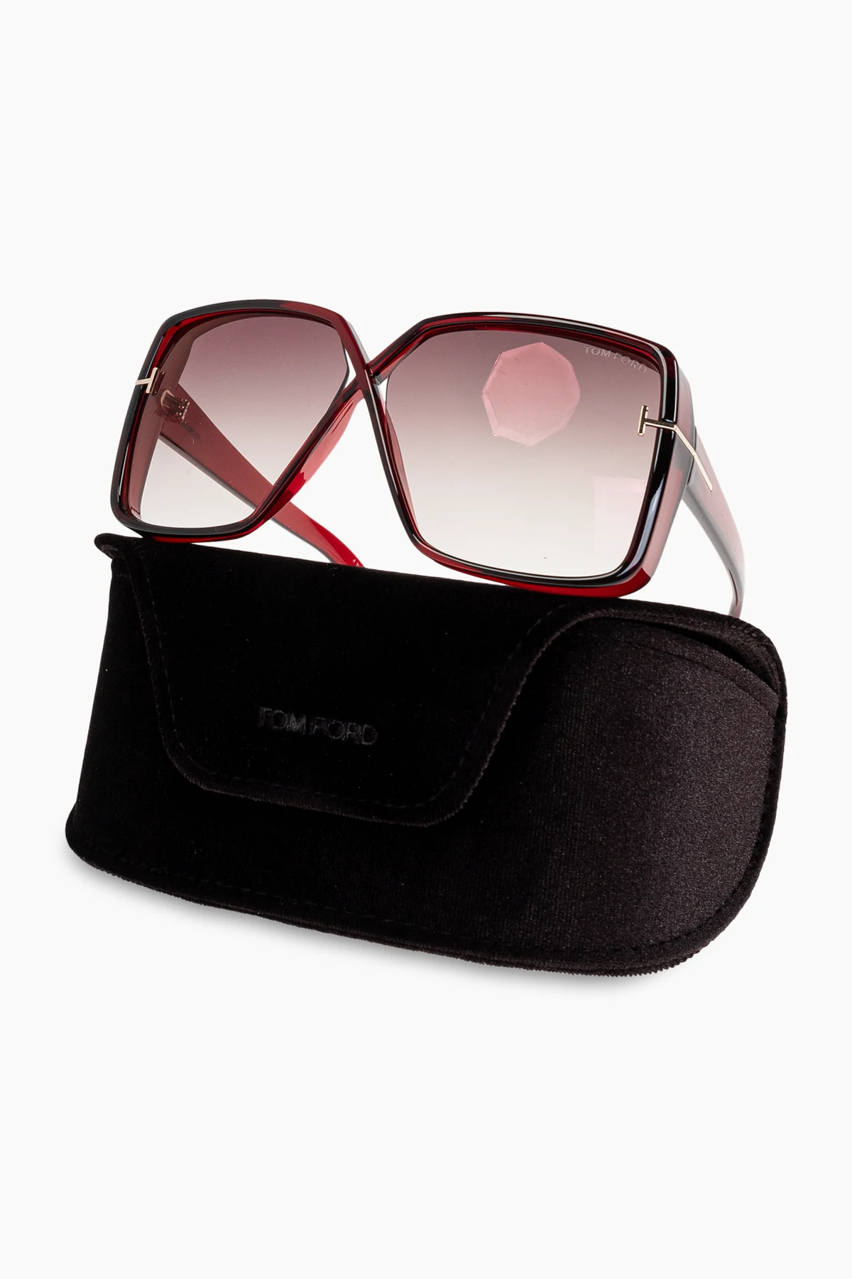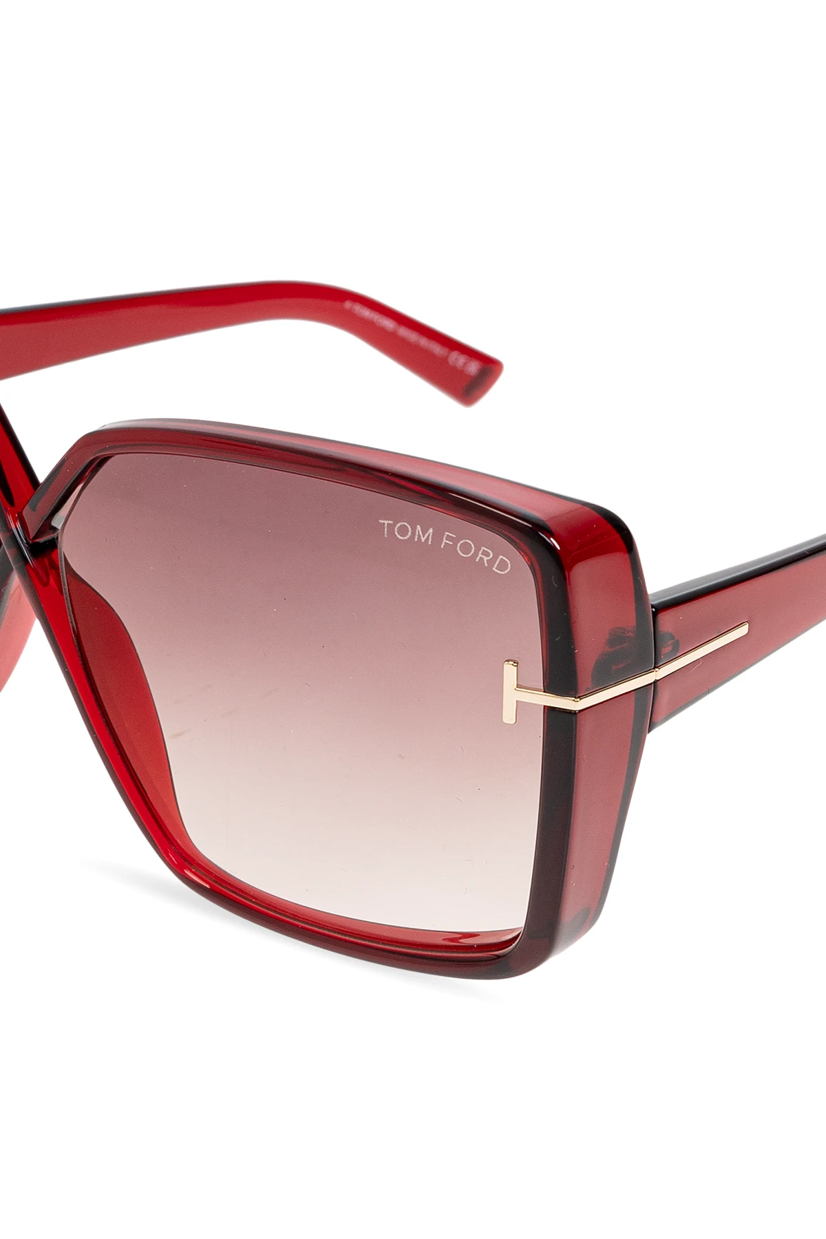 Nasycony czerwony kolor oprawek, w połączeniu z metalowymi elementami i logo "TOM FORD" na soczewkach, dodaje im wyrazistości i elegancji. Charakterystyczne metalowe detale w kształcie litery "T" na zawiasach podkreślają ich unikatowość.