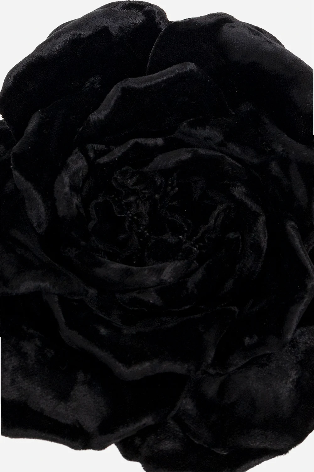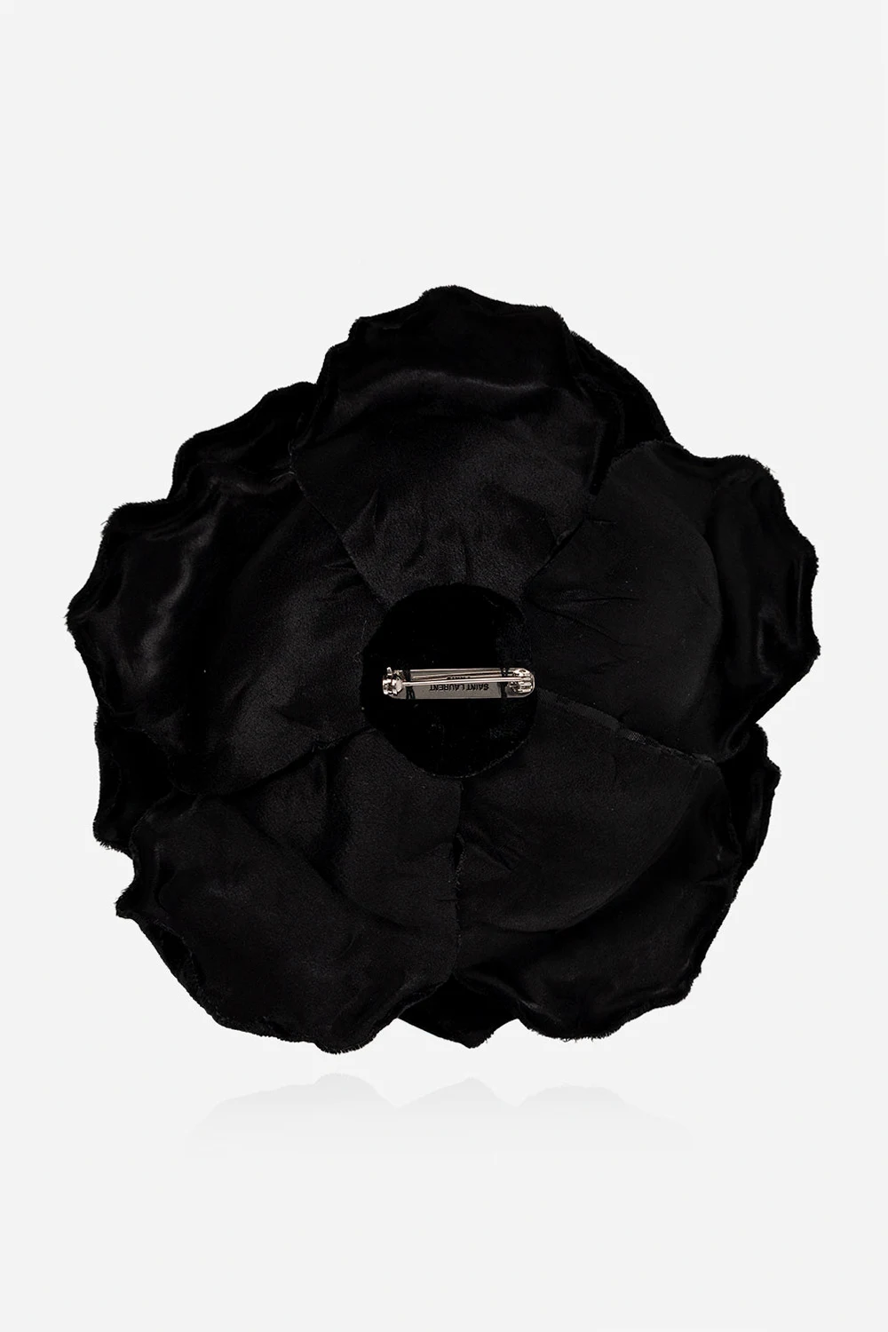 Czarna, aksamitna broszka w kształcie kwiatu Saint Laurent. Zapięcie na haftkę.