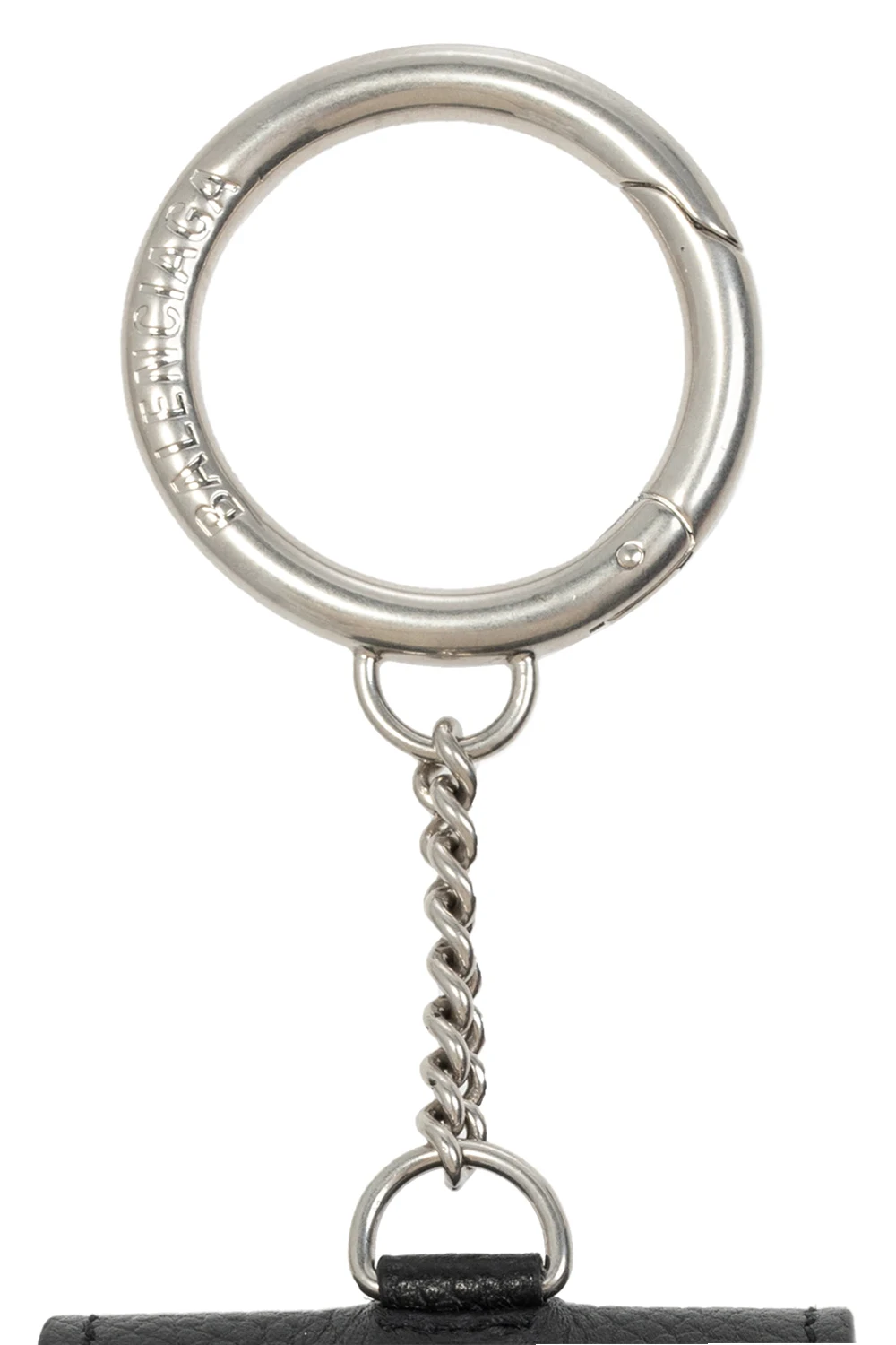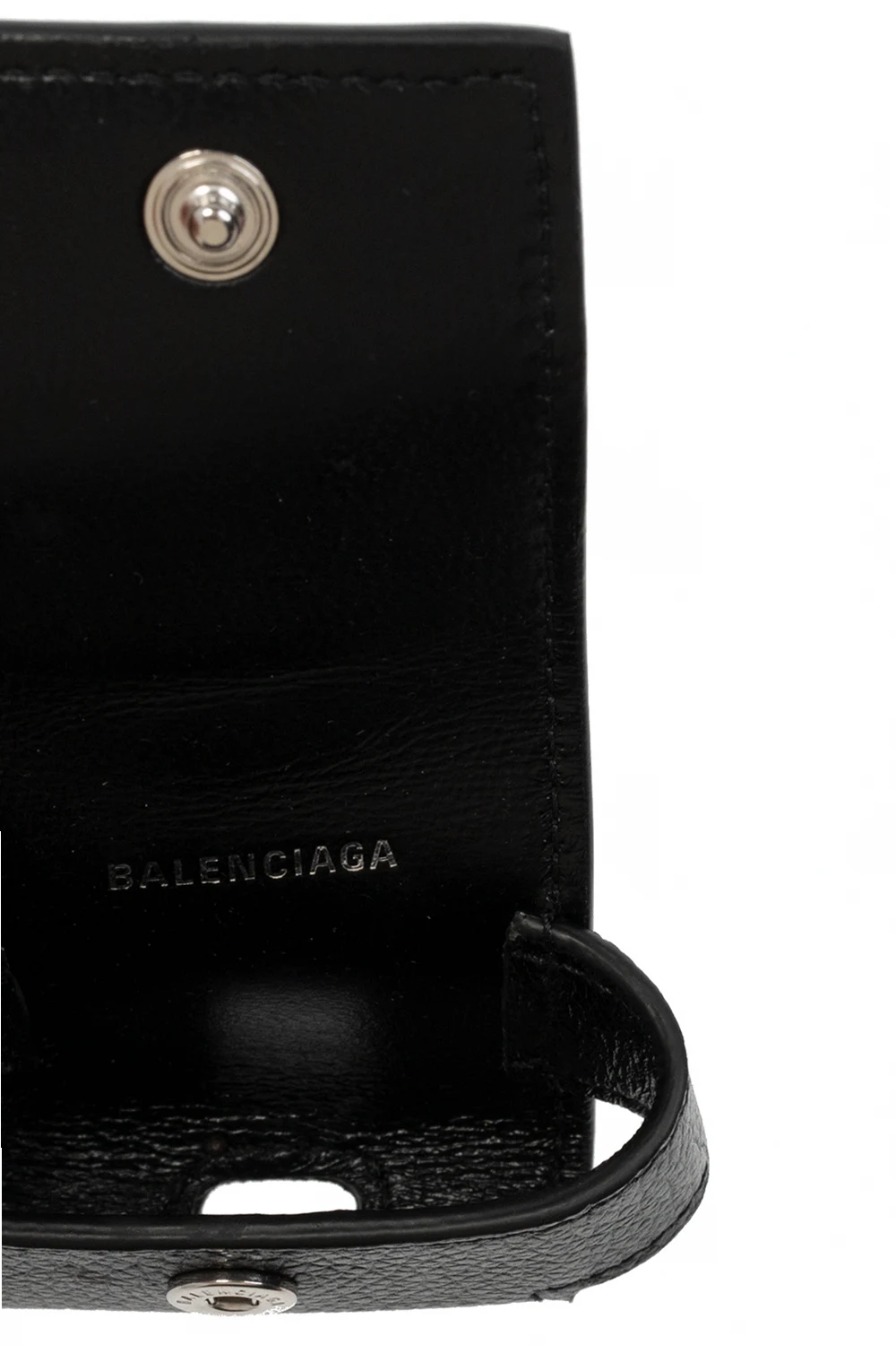 Czarne etui na słuchawki bezprzewodowe AirPods Balenciaga. Wykonane ze skóry o ziarnistej fakturze. Zamykane na zatrzask. Ozdobione nadrukowanym logo w kolorze białym.