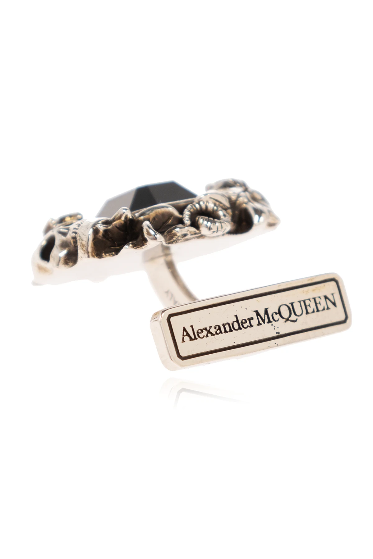 Mosiężna spinki do mankietów w kolorze srebrnym Alexander McQueen. Ozdobione rzeźbionymi detalami z motywem bluszczu i czaszki oraz kamieniami w kolorze czarnym. Na zapięciu wygrawerowane logo.