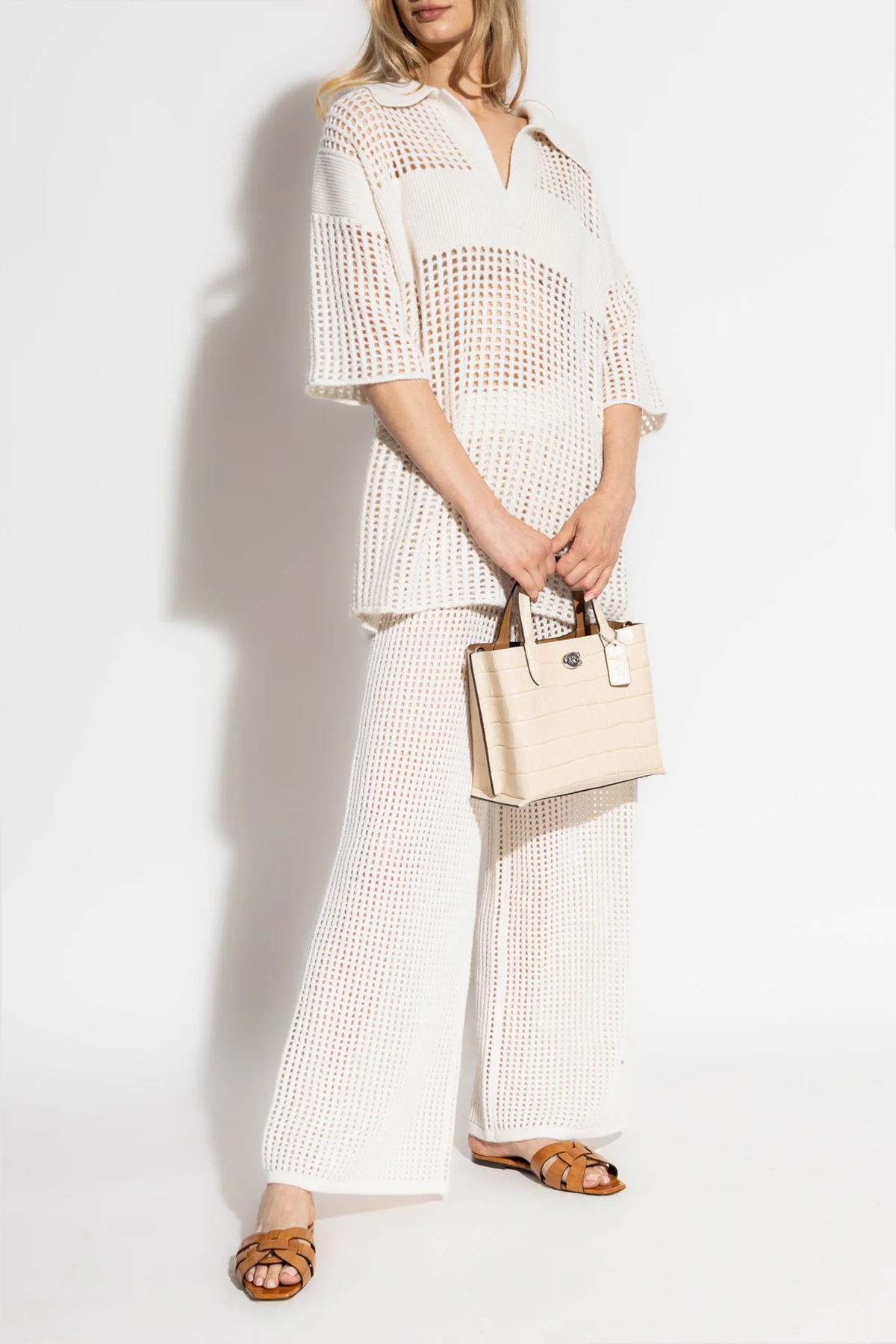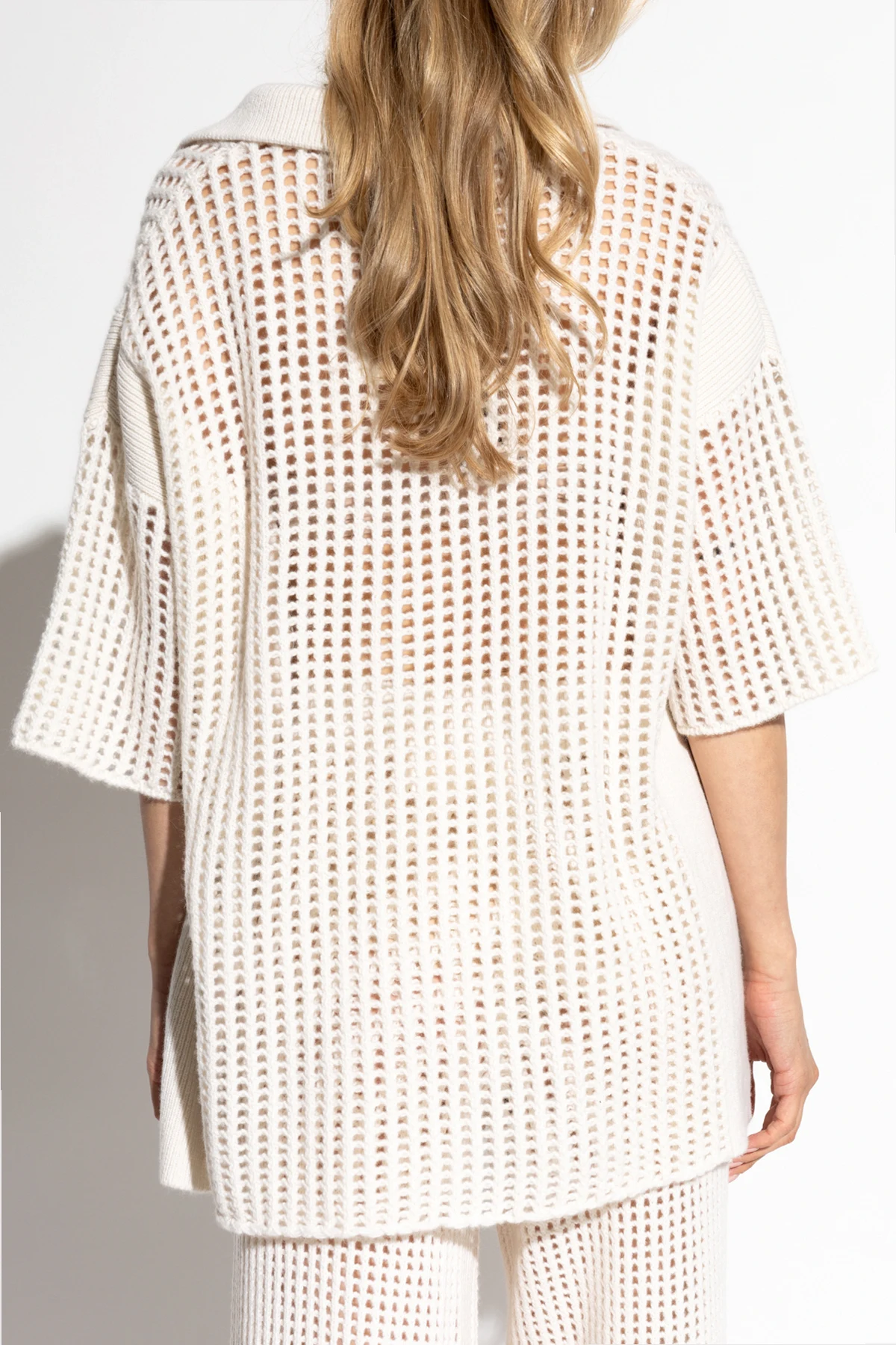 Pośród tkanin, które definiują luksus i komfort, kaszmir króluje niepodzielnie, a koszulka "Polo`Lei`" od Lisy Yang jest tego najwyraźniejszym dowodem. Wykonana w całości z tego szlachetnego materiału, koszulka polo z krótkim rękawem zachwyca swoją kremową barwą, która dodaje jej ponadczasowej elegancji. Nie tylko materiał, ale również design sprawiają, że jest to produkt wyjątkowy. Charakterystyczne dla stylu polo, zapięcie na guziki oraz kołnierzyk w kształcie litery "V" nadają jej klasycznego szyku, podczas gdy unikalny wzór ażurowej siateczki, utworzony przez precyzyjnie wykonane perforacje, wprowadza element nowoczesności.
