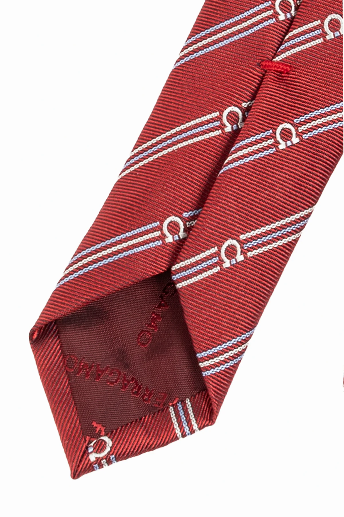 Wewnętrzna strona krawata wykończona jest bordową tkaniną z wyhaftowanym logo projektanta w kolorze czerwonym, co świadczy o dbałości o najmniejsze detale. Staranne wykończenie i precyzja wykonania są znakami rozpoznawczymi ekskluzywnych marek modowych.