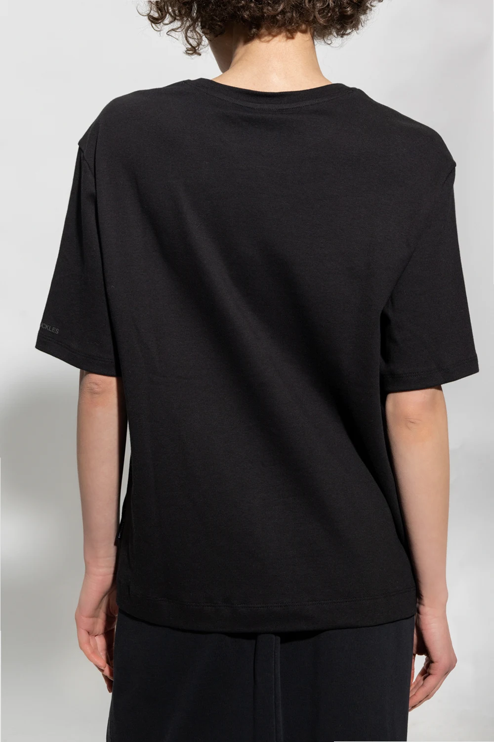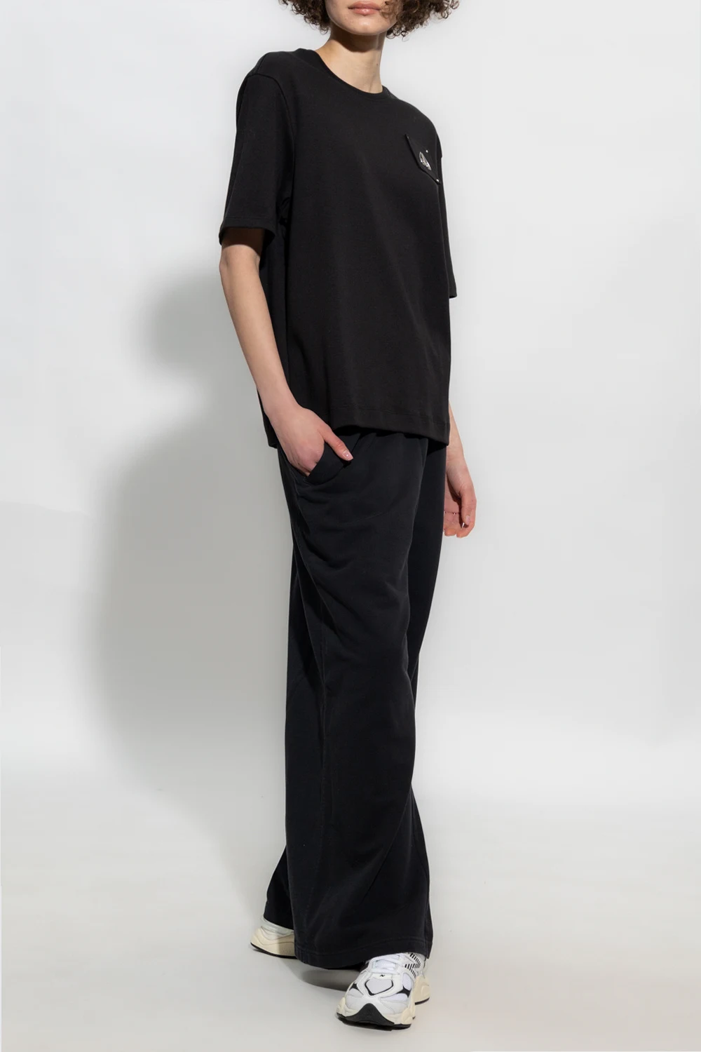 – Czarny T-shirt z krótkimi rękawami i wycięciem w dekolcie