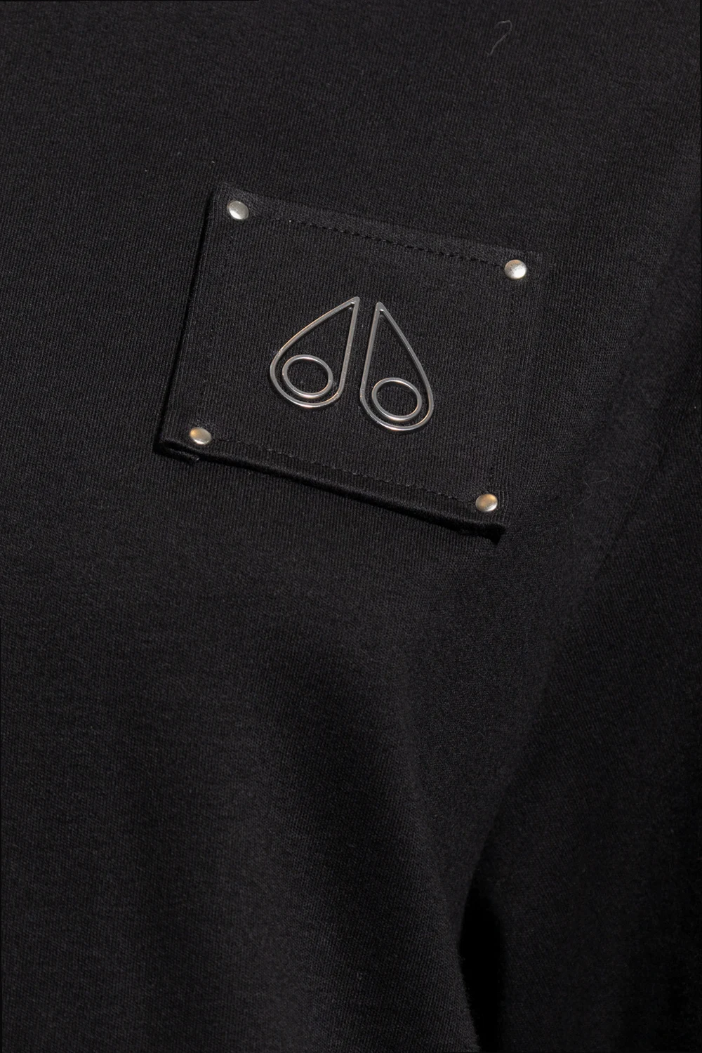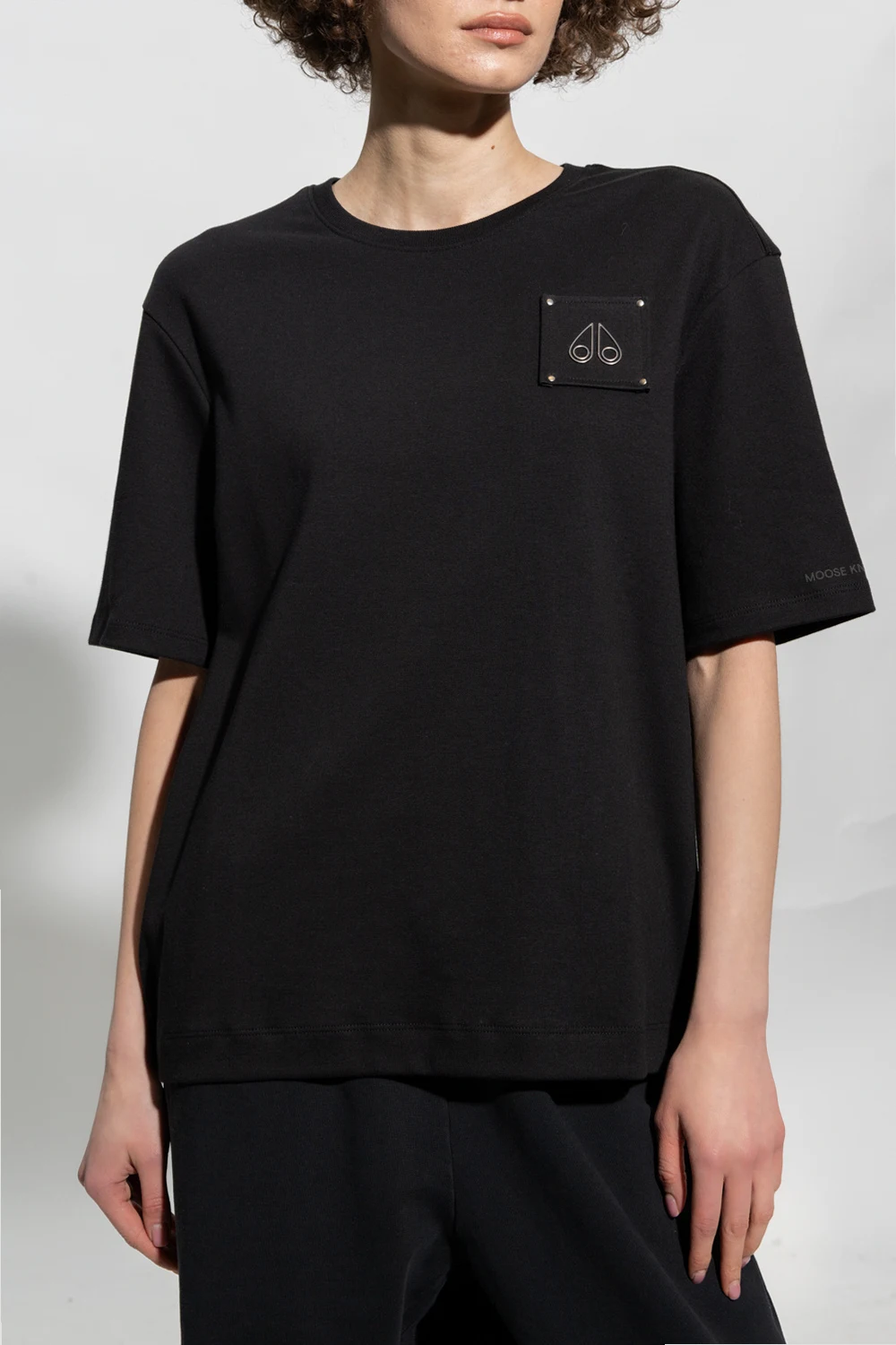Czarny, bawełniany t-shirt o luźnym kroju Moose Knuckles. Z przodu ozdobiony naszywką z logo. Okrągły dekolt wykończony jasnoszarym ściągaczem. Krótkie rękawy - na jednym wypukłe logo.