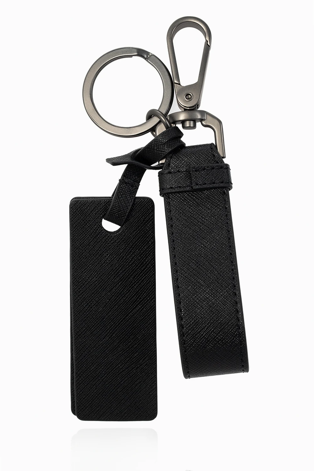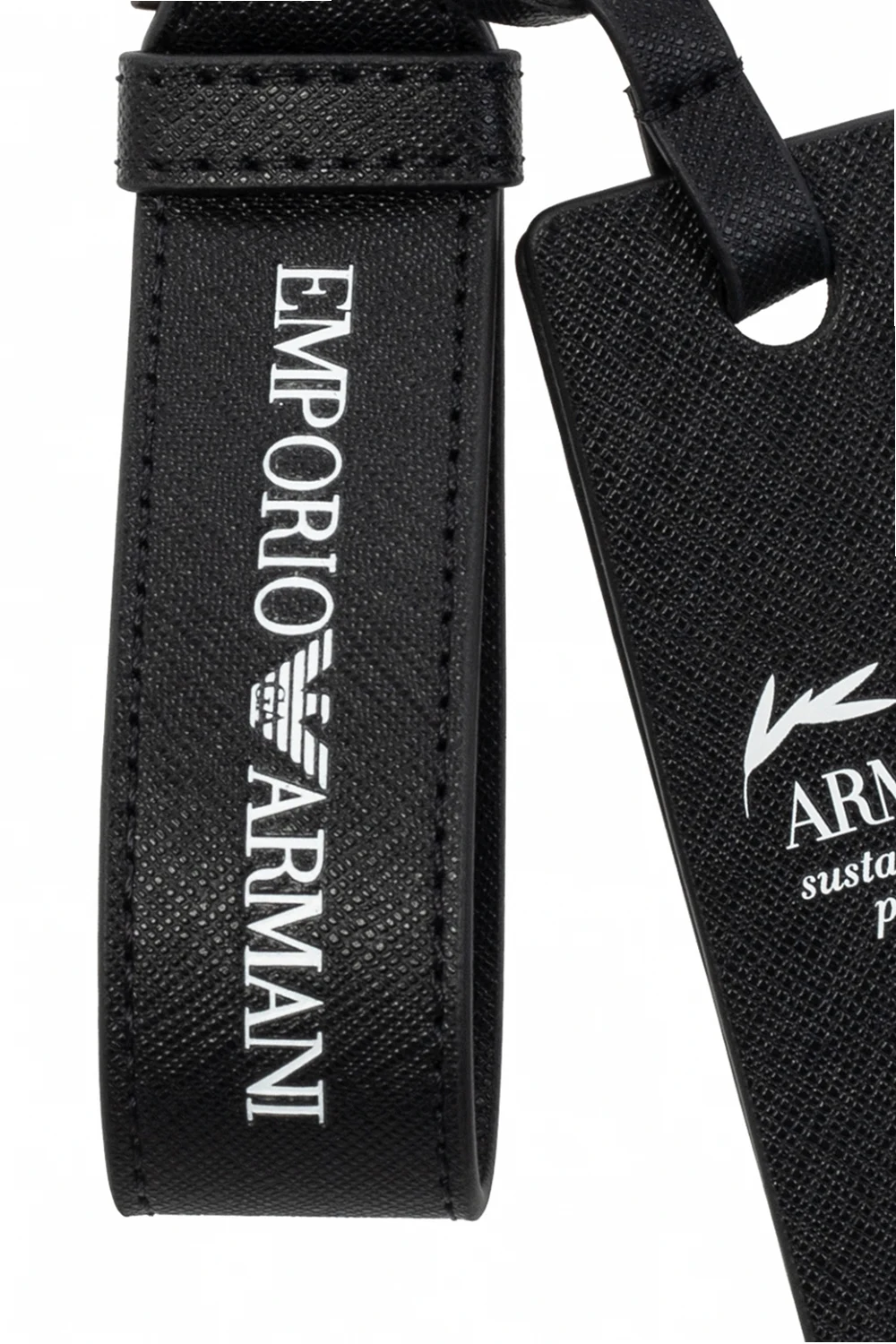 Czarny brelok Emporio Armani. Wykonany ze skóry z recyklingu. Ozdobiony nadrukowanym logo w kolorze białym.