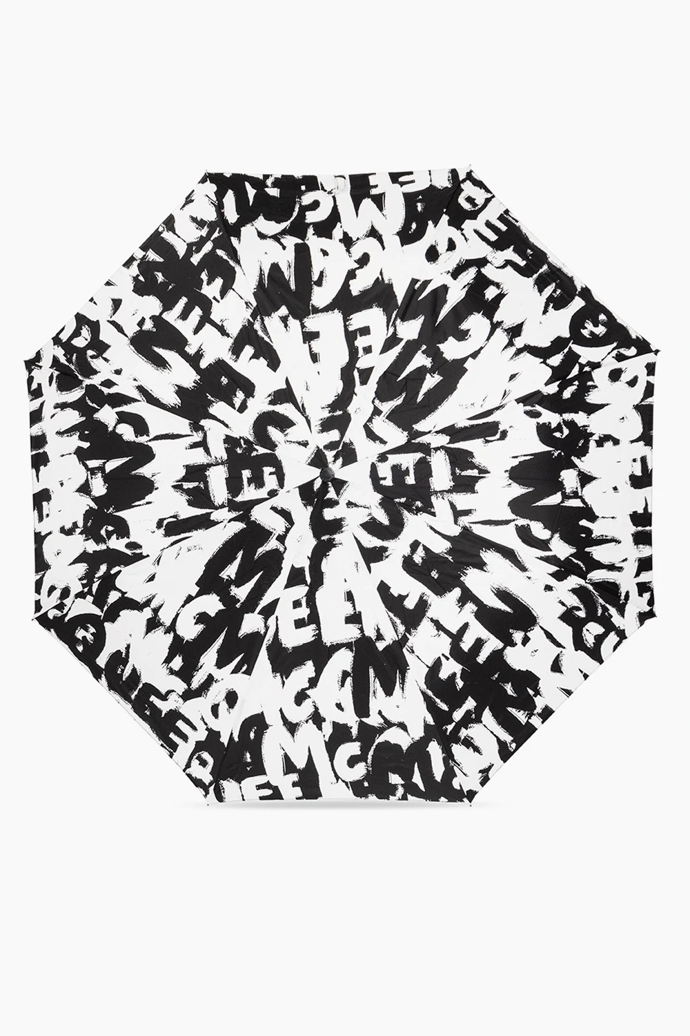 Czarno-biały parasol Alexander McQueen. Zapinany na pasek z zatrzaskiem. Ozdobiony wzorem z logo. Czarna, skórzana rączka ozdobiona metalową aplikacją z wygrawerowanym logo w kolorze srebrnym. Dołączone etui.
