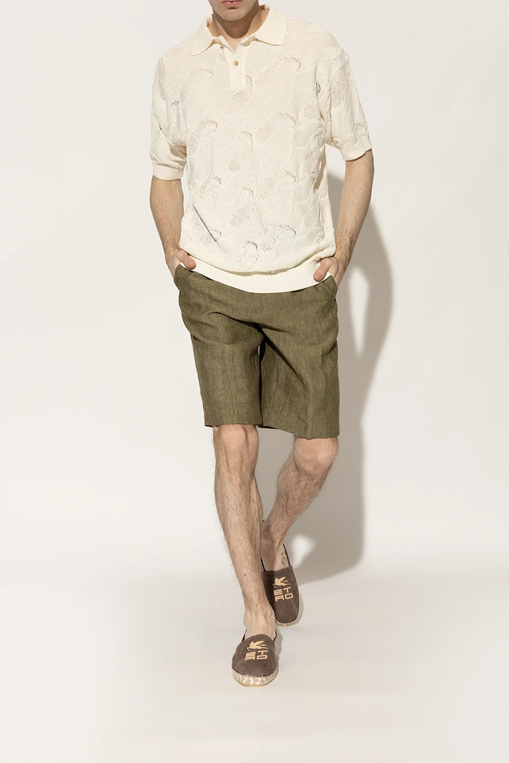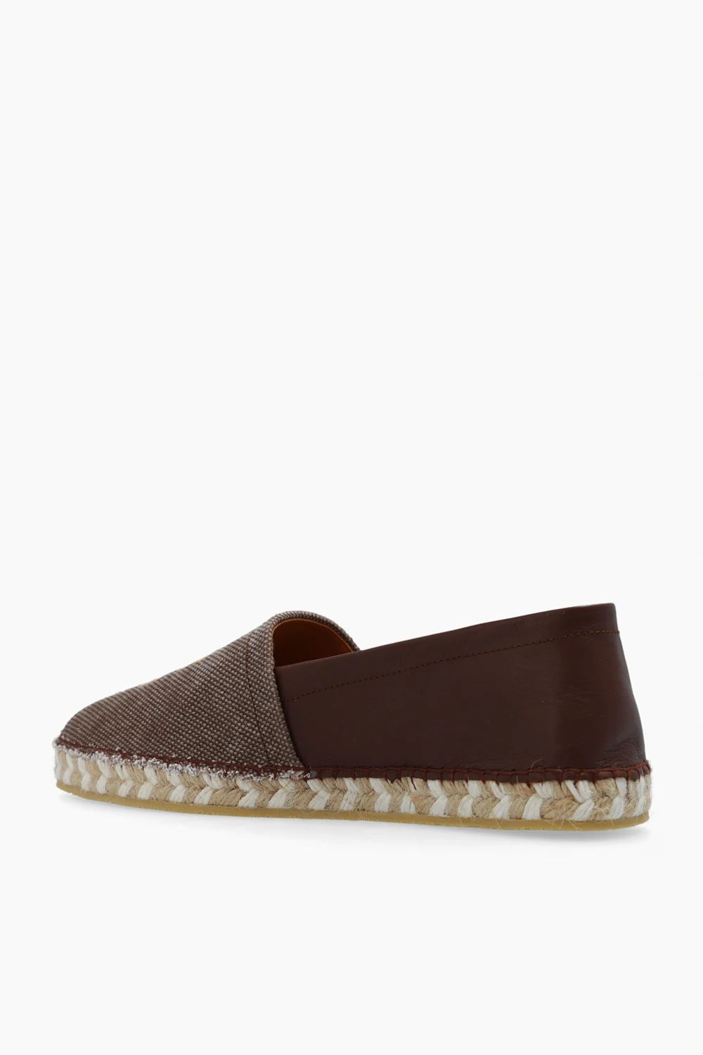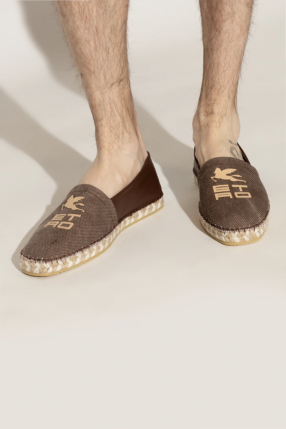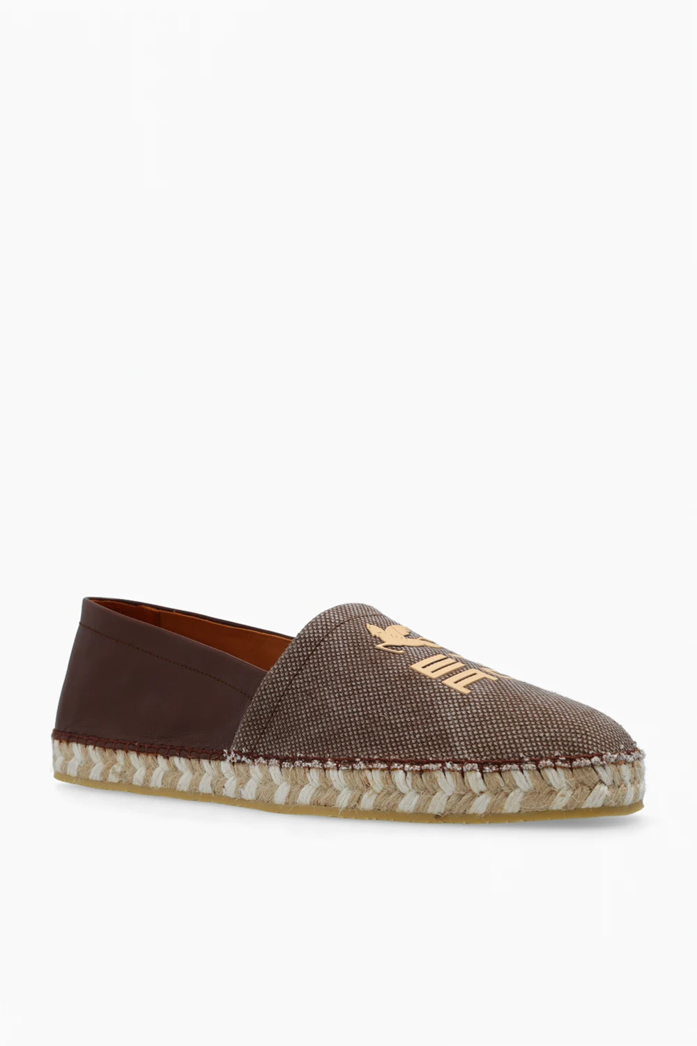 Brązowe espadryle Etro. Wykonane z bawełnianego płótna i skóry cielęcej. Z przodu beżowa aplikacja w kształcie logo. Kremowo-beżowa, pleciona podeszwa z juty wykończona gumą.