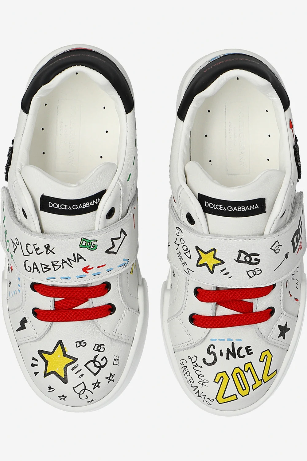 Białe, sznurowane buty sportowe, model 'Bassa' Dolce & Gabbana Kids. Wykonane ze skóry. Zapinane na szeroki rzep. Ozdobione kolorowymi nadrukami. Z boku aplikacja z logo w kolorze czarnym. Biała, gumowa podeszwa.