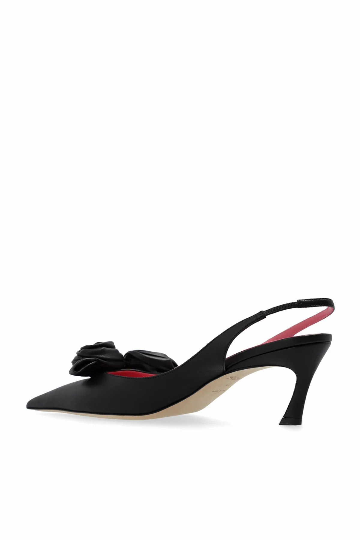 Buty wyróżnia smukły, wysoki obcas, który nadaje sylwetce zgrabności i elegancji. Detal w postaci dekoracyjnej aplikacji w kształcie róży, umieszczonej nad palcami, dodaje całości niepowtarzalnego charakteru. Materiał, z którego zostały wykonane buty, to najwyższej jakości skóra, gwarantująca nie tylko prestiż, ale również komfort noszenia. Delikatny pasek okrążający piętę zapewnia stabilność, a kontrastowe, prawdopodobnie różowe wnętrze dodaje subtelnego akcentu.