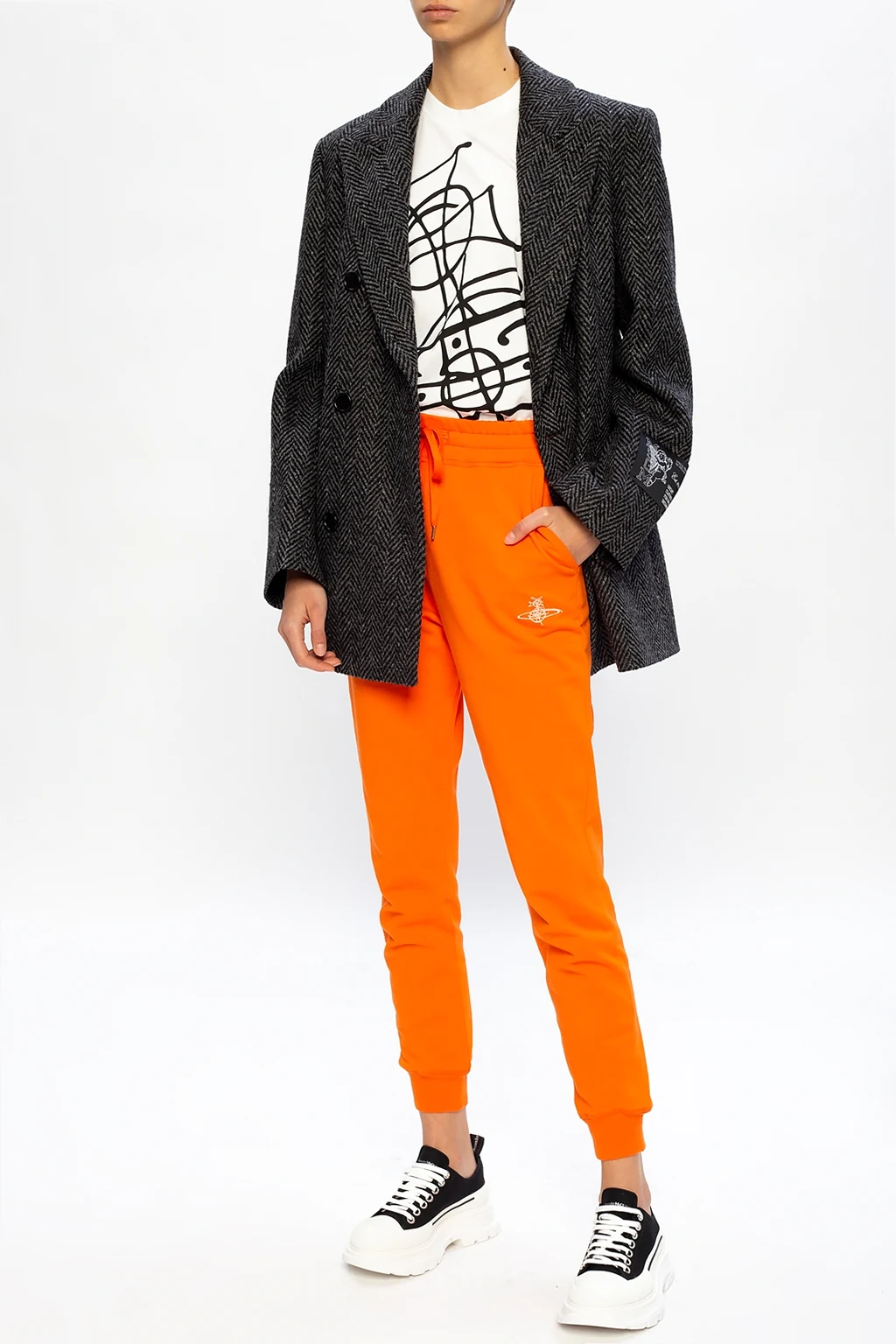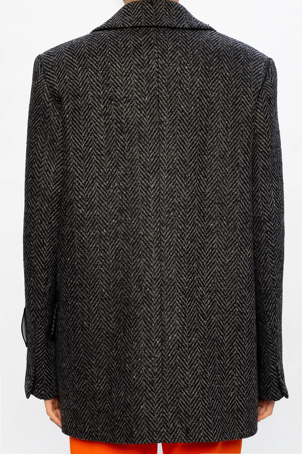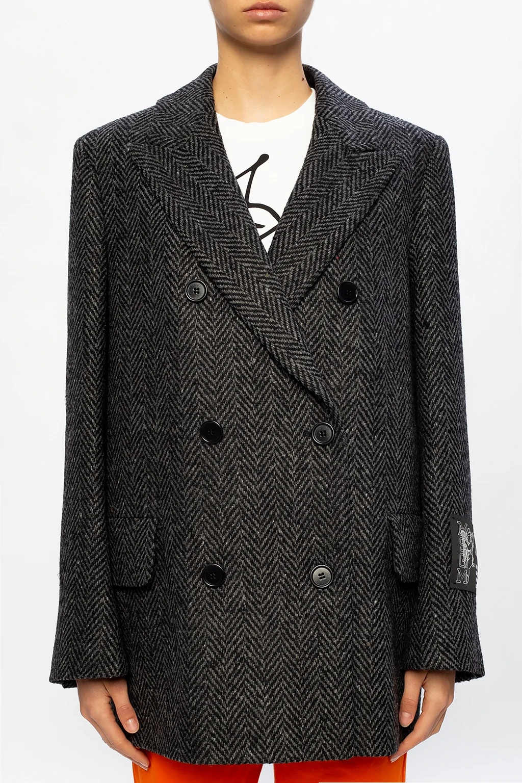 Szaro-czarna marynarka MSGM. Wykończona wełną. Zapinana na dwurzędowe guziki. Na rękawie naszywka z wyszytym wzorem z logo. Z przodu dwie kieszenie z patkami. W ramionach wszyte poduszki.
