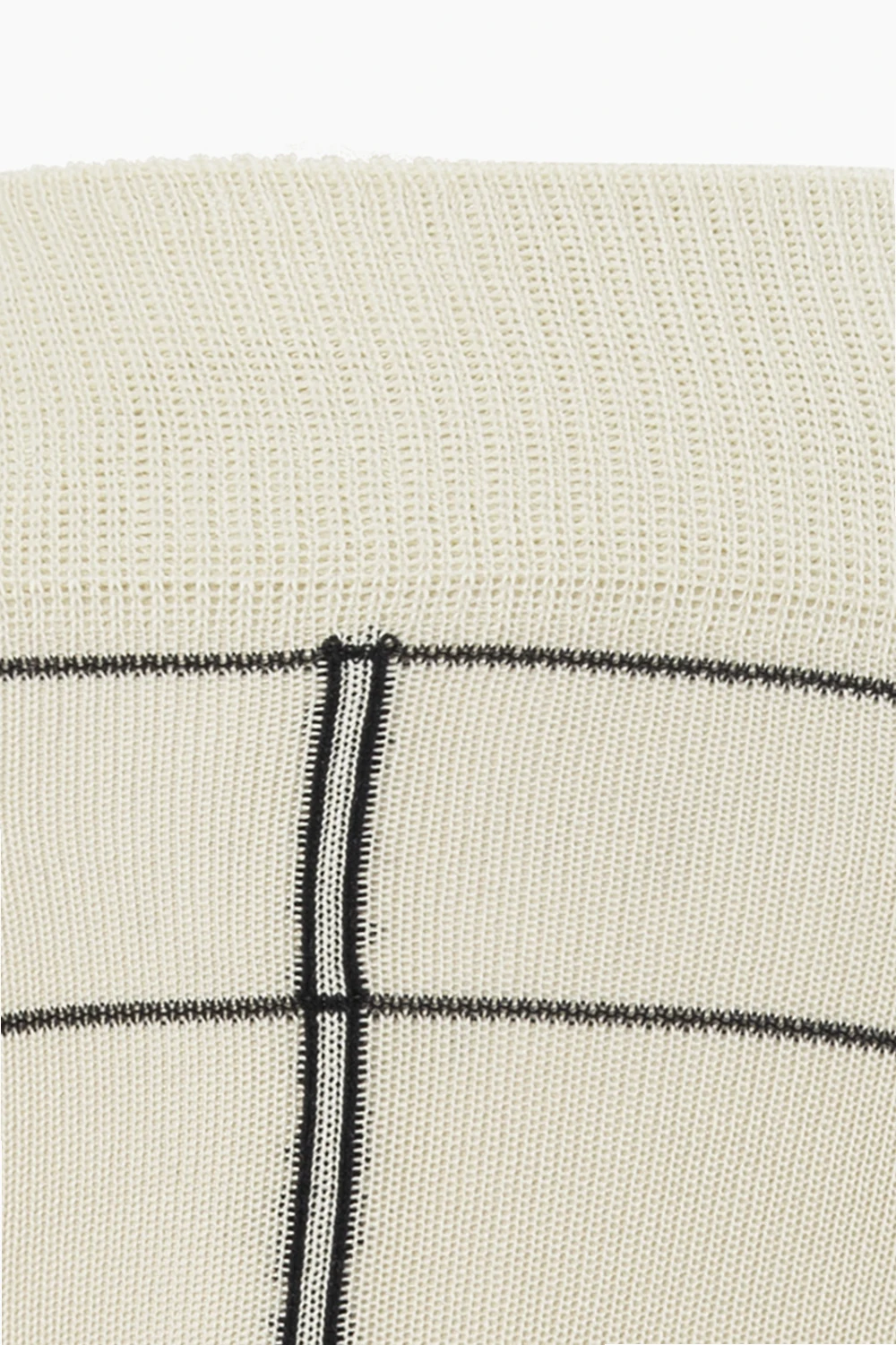 Kremowe skarpety JIL SANDER. Wykonane z jedwabiu. Ozdobione wzorem w kratę w kolorze czarnym. Wykończone ściągaczem.