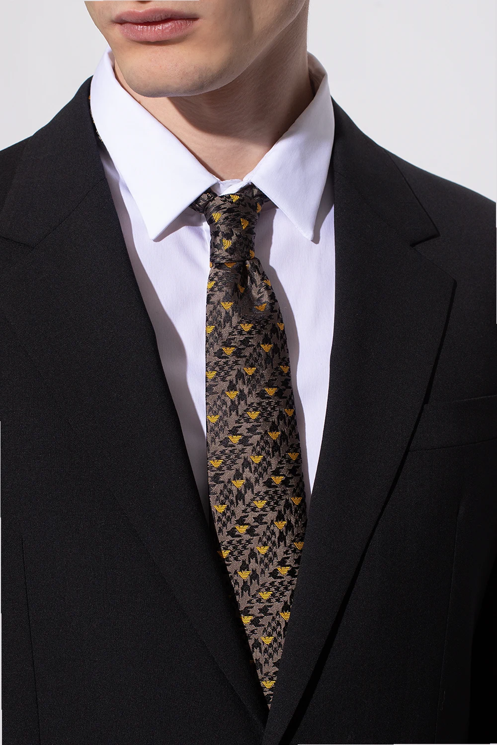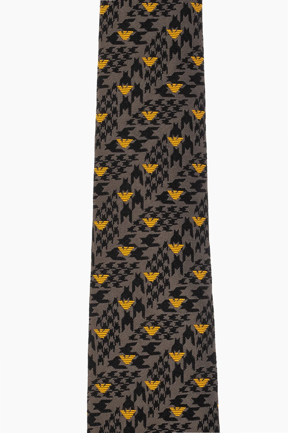 Szary, jedwabny krawat Emporio Armani. Ozdobiony wyszytym żółtym logo i czarnym wzorem w pepitkę.