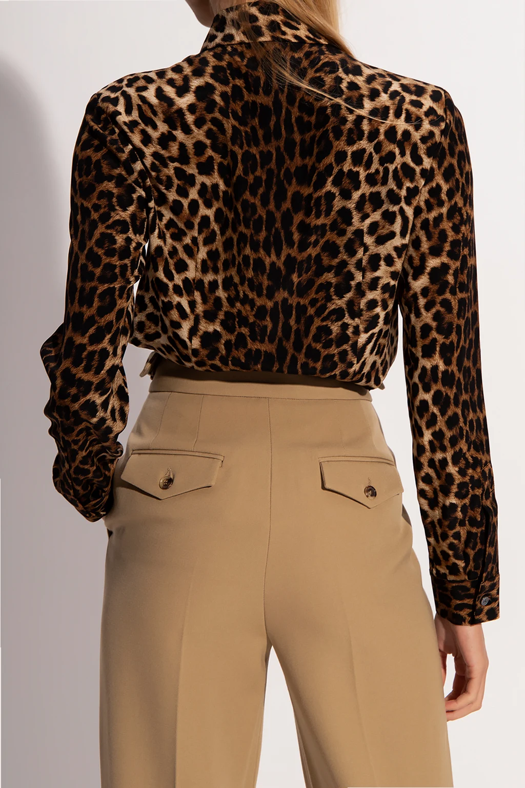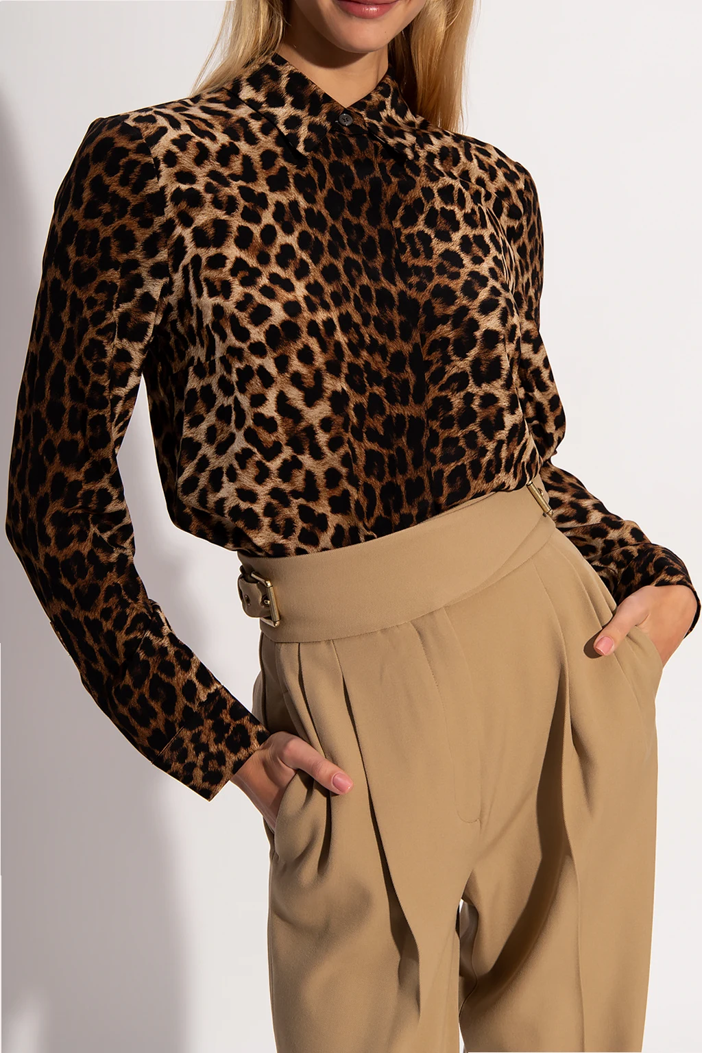 Brązowo-czarna, jedwabna koszula Michael Kors. Zapinana na guziki. Ozdobiona wzorem z motywem zwierzęcym. Długie rękawy zakończone mankietem z zapięciem na guzik.