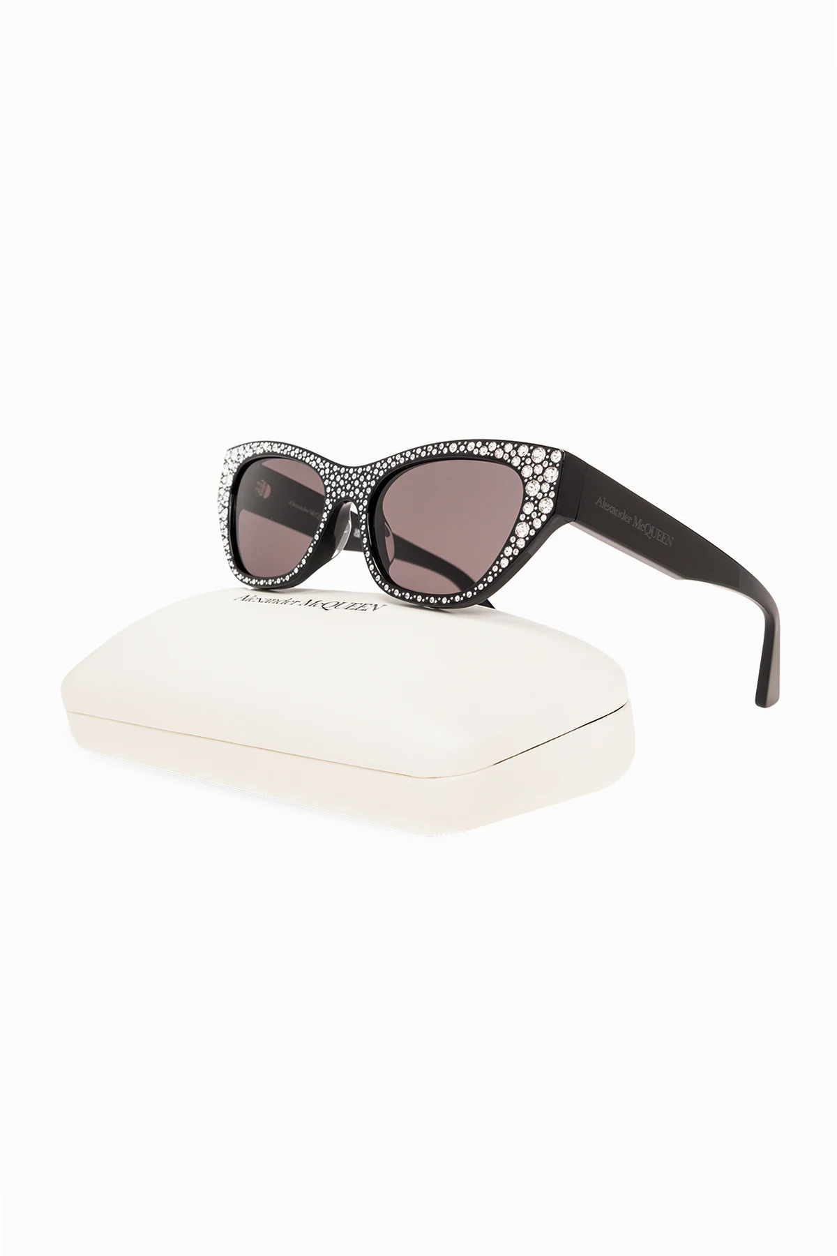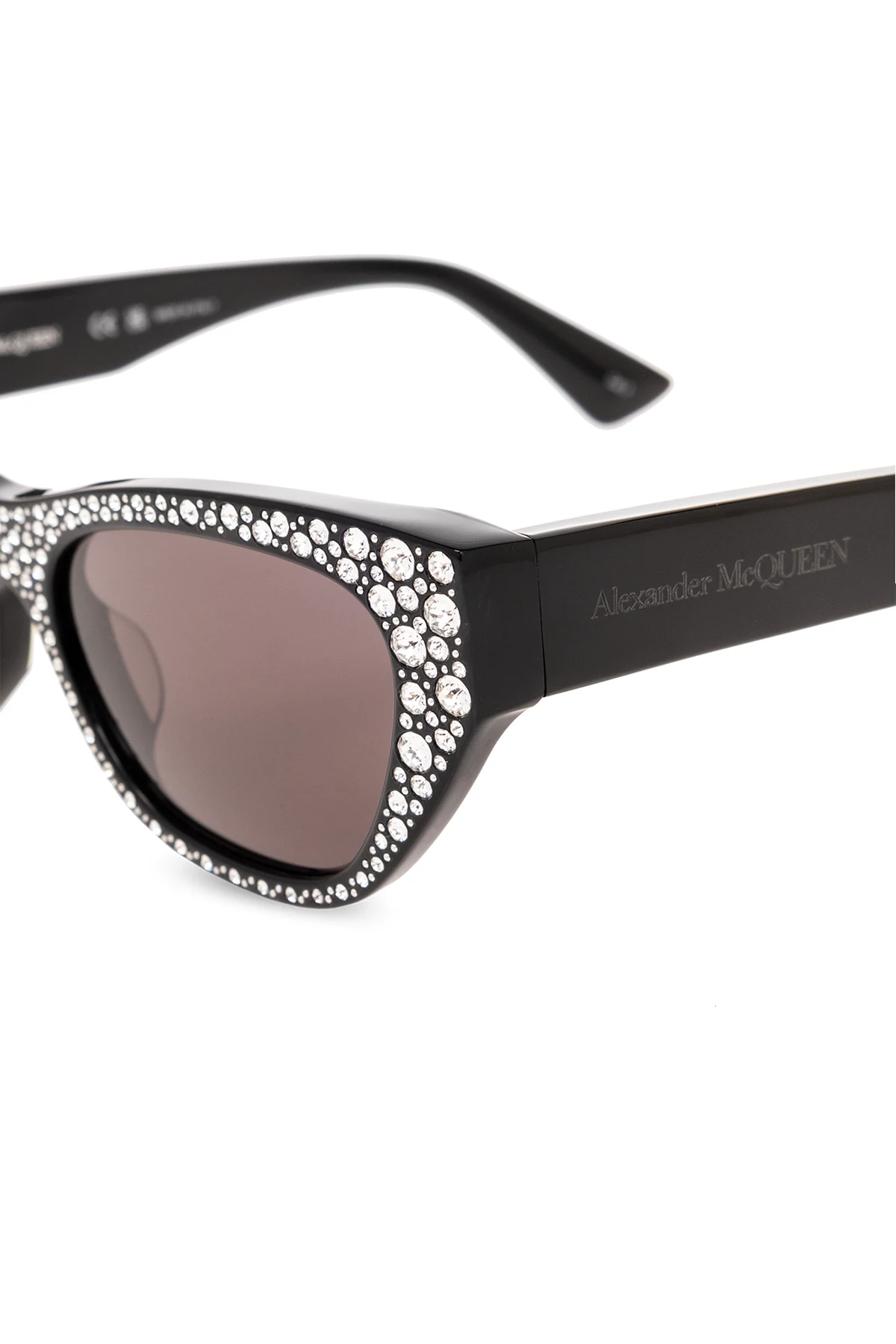 Czarne okulary przeciwsłoneczne Alexander McQueen. Wysadzane połyskującymi kryształami. Zauszniki ozdobione wygrawerowanym logo. Metalowe detale w kolorze srebrnym. Szare soczewki z ochroną przed promieniowaniem UV (kat. 3). Dołączone etui.