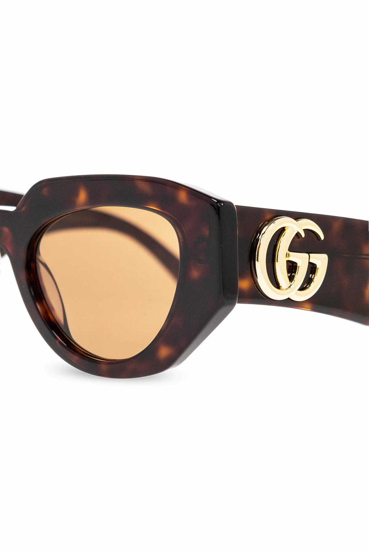 Brązowo-czarne, szylkretowe okulary przeciwsłoneczne Gucci. Oprawki w kształcie kocich oczu. Zauszniki ozdobione aplikacją w kształcie logo w kolorze złotym. Brązowe soczewki ze 100% ochroną przed promieniowaniem UV. Dołączone etui w losowo wybranym kolorze.
