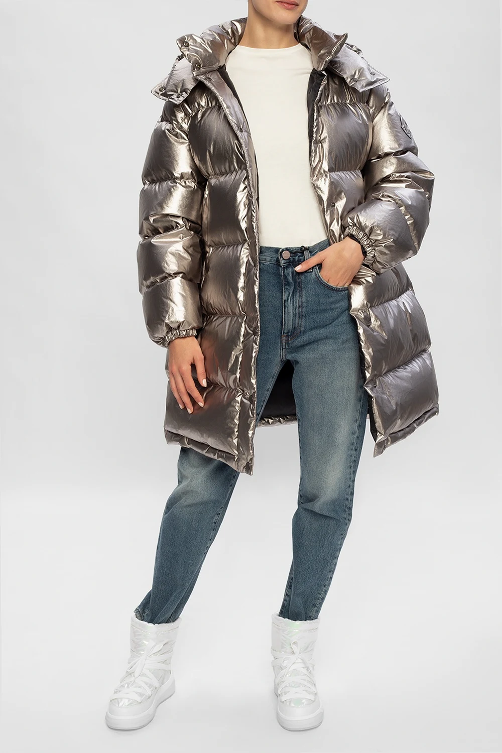 Białe, sznurowane śniegowce, model ‘Insolux’ Moncler. Ozdobione połyskującym materiałem. Ściągane trokami. Biała, gumowa podeszwa.