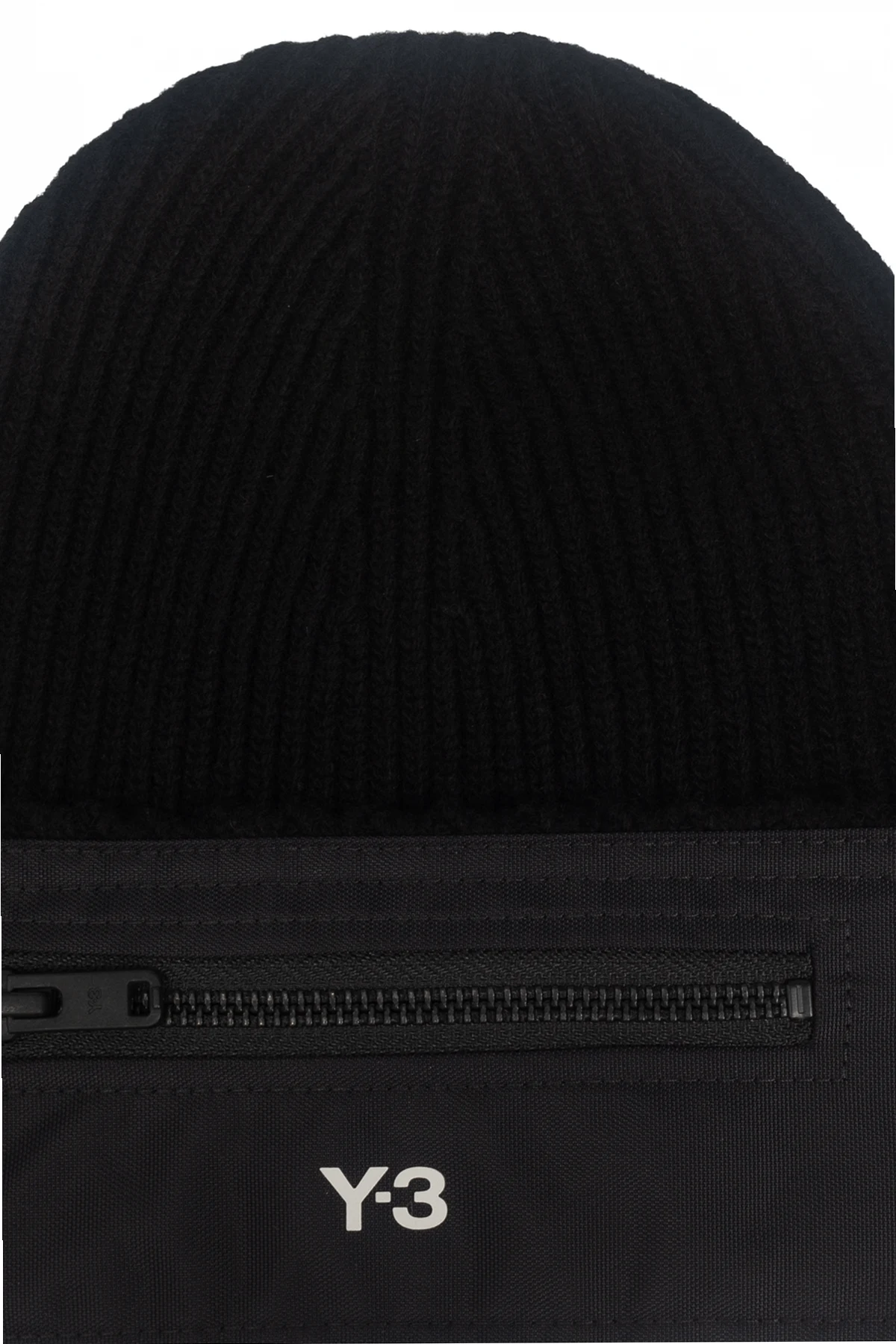 Na przodzie czapki znajduje się funkcjonalna kieszeń zapinana na zamek błyskawiczny, wykonana z gładkiego materiału kontrastującego z prążkowaną dzianiną. Czarny zamek błyskawiczny harmonizuje z resztą czapki, a wyraźne, białe logo "Y-3" na kieszeni stanowi subtelny, ale rozpoznawalny element marki.