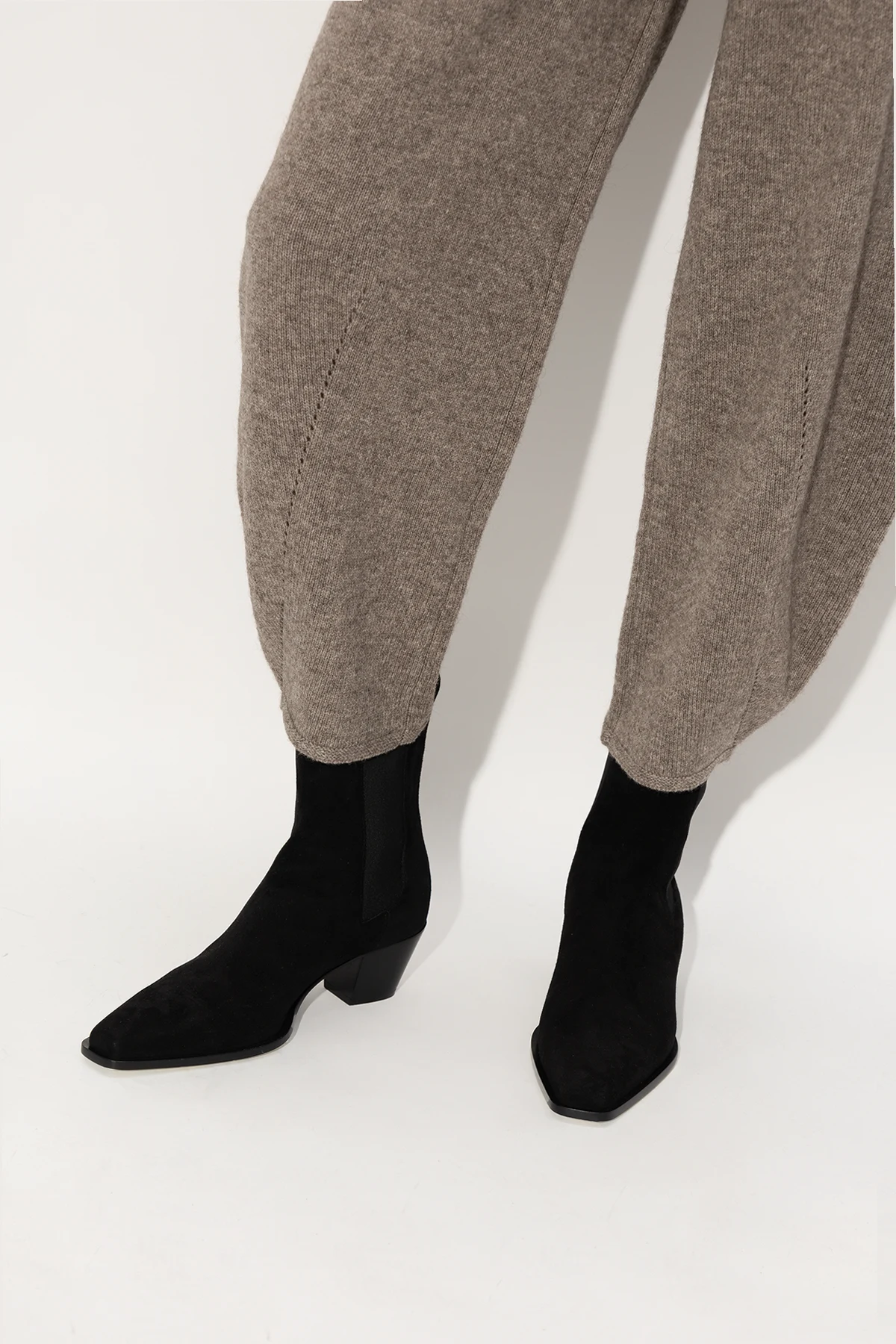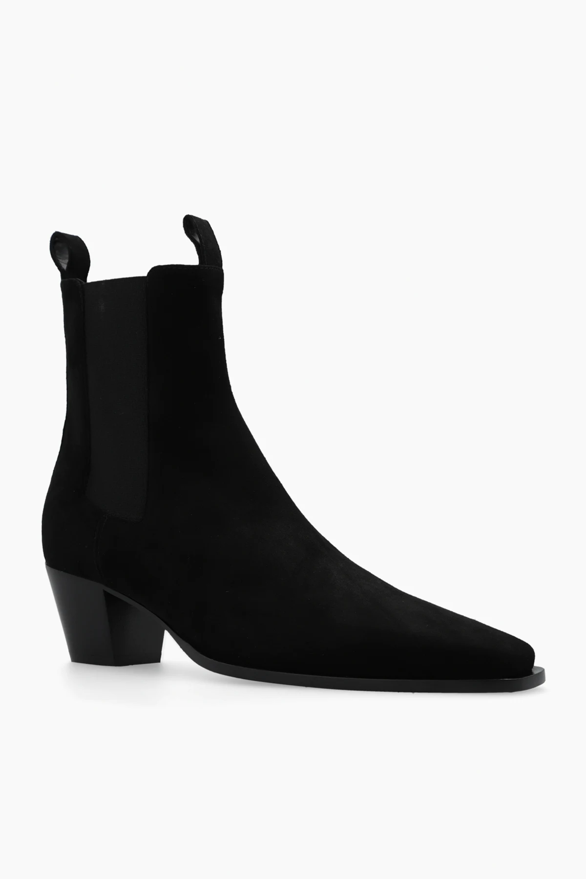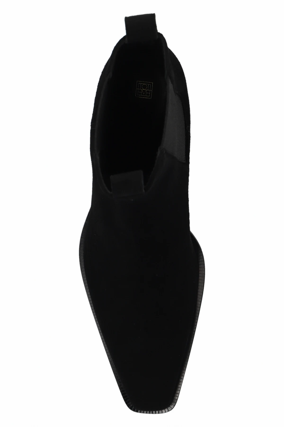 Czarne botki na obcasie Toteme. Wykonane z zamszu. Po bokach wszyta guma. Kwadratowy, nosek w szpic. Czarna, skórzana podeszwa.