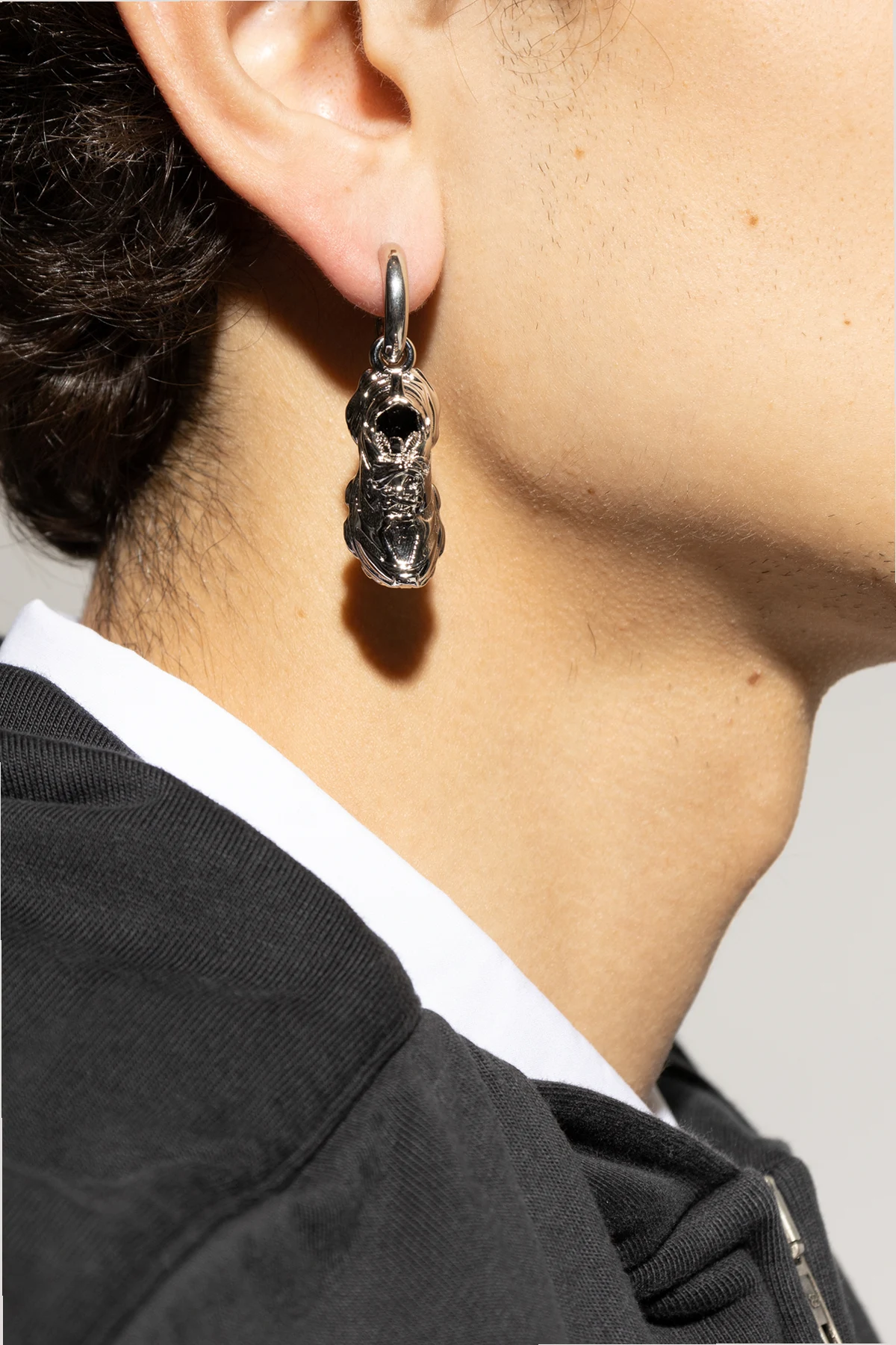 Prezentacja kolczyka na uchu modela/modelki ukazuje, jak perfekcyjnie komponuje się on z okrągłym dekoltem, podkreślając elegancję i wyjątkowy charakter stylizacji. Zawieszenie na dużym, okrągłym zapięciu nie tylko zapewnia wygodę użytkowania, ale również stanowi integralną część estetycznego doświadczenia. Dokładne wykonanie widoczne na zbliżeniach podkreśla precyzję i dbałość o każdy detal.