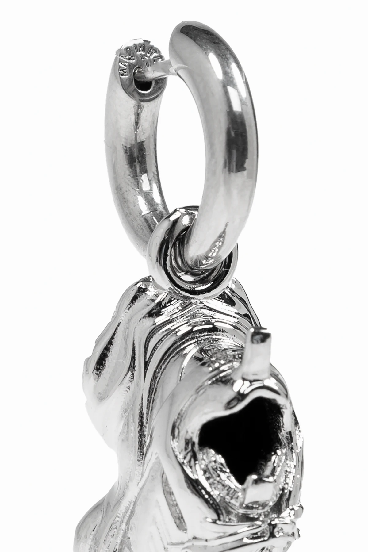 Jego niepowtarzalna forma, inspirowana być może kształtem twarzy lub abstrakcyjną maską, przyciąga uwagę nieregularnymi, płynnymi liniami, które tworzą wrażenie ruchu i dynamiki. Takie wzornictwo sprawia, że kolczyk jest nie tylko ozdobą, ale prawdziwym dziełem sztuki. Polerowany materiał gwarantuje intensywny połysk, który zachwyca pod każdym kątem.