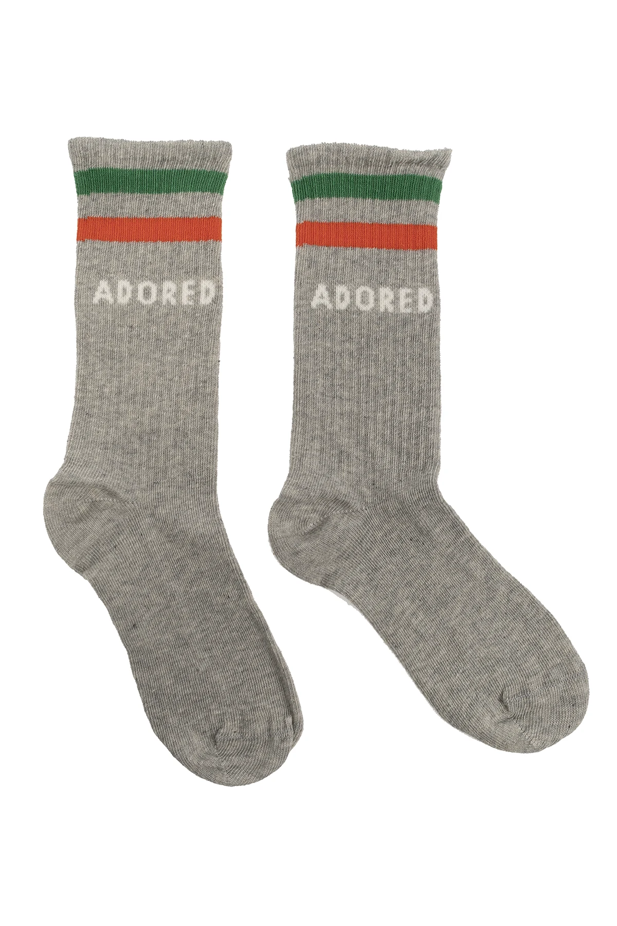 Trójpak skarpet w kolorze białym, szarym i beżowo-zielonym Mini Rodini. Wykonane z bawełny organicznej z certyfikatem GOTS. Ozdobione kolorowymi paskami, napisem, motywem pieska i wzorem ‘moro’. Wykończone ściągaczem.