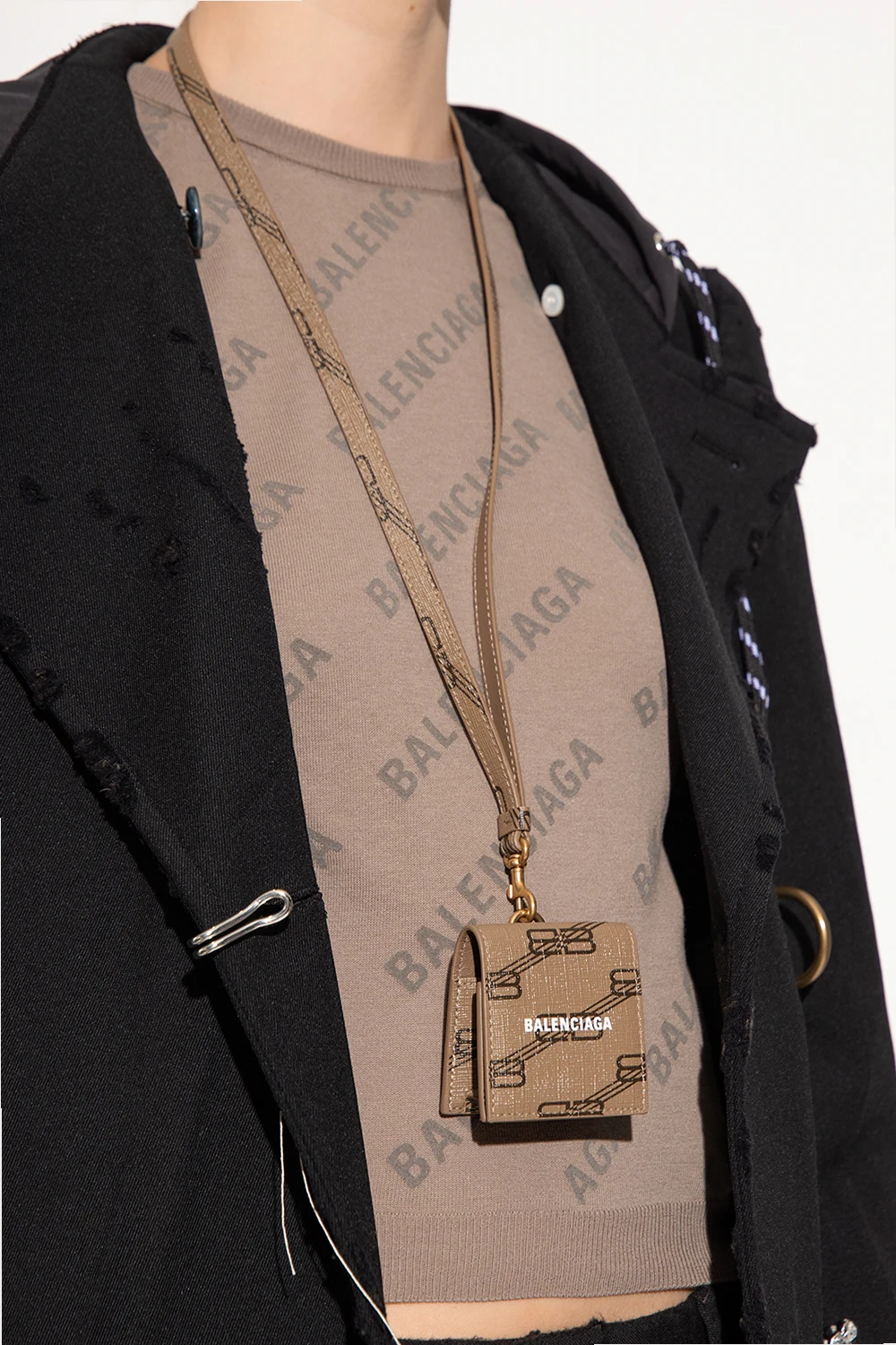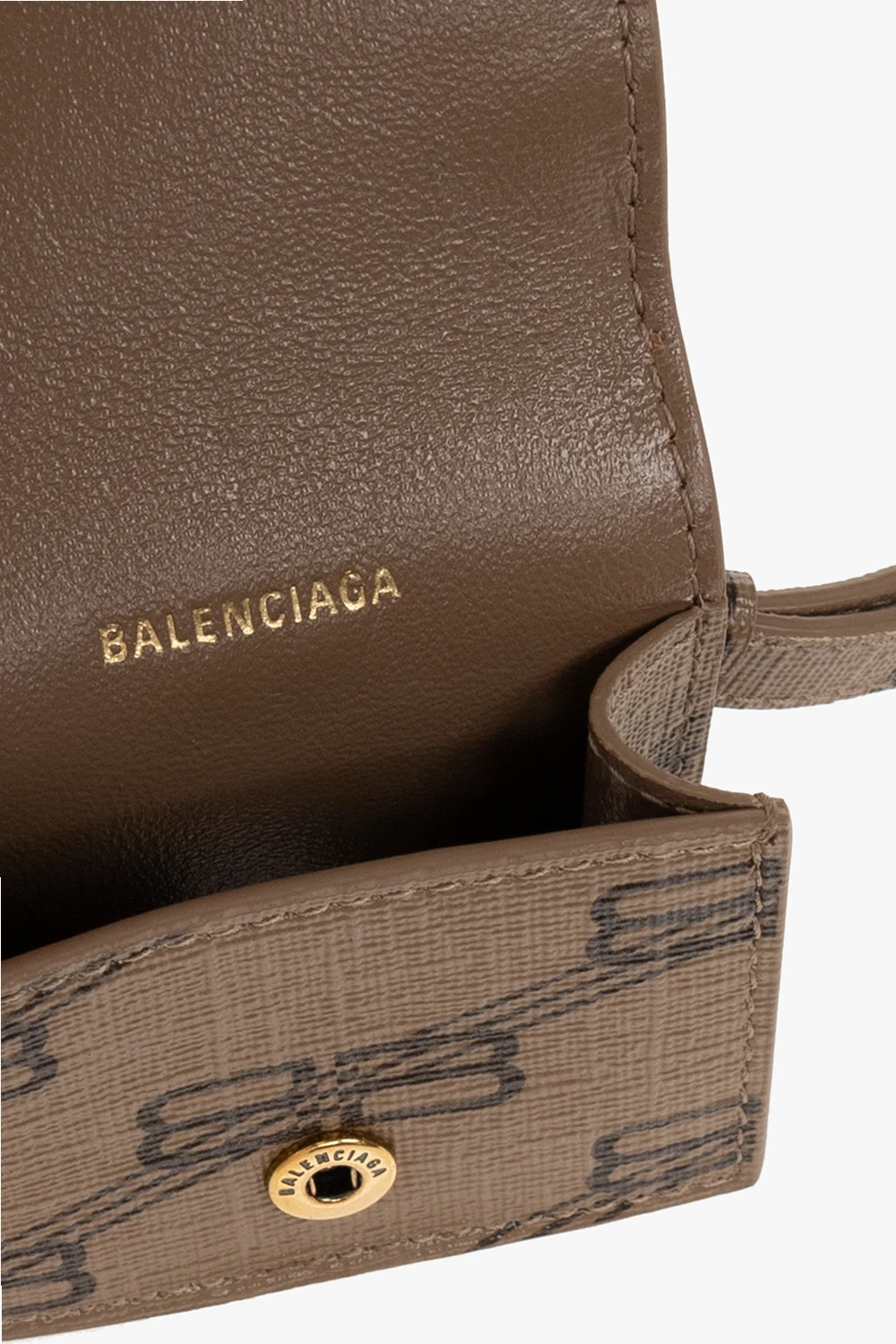 Brązowe etui na AirPods 3 Balenciaga. Wykonane z powlekanego płótna ozdobionego wzorem z monogramem ‘BB’. Zamykane na zatrzask. Z przodu nadrukowane logo w kolorze białym. Odpinany pasek. Metalowe elementy w kolorze złotym.