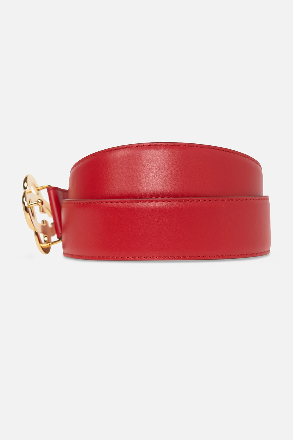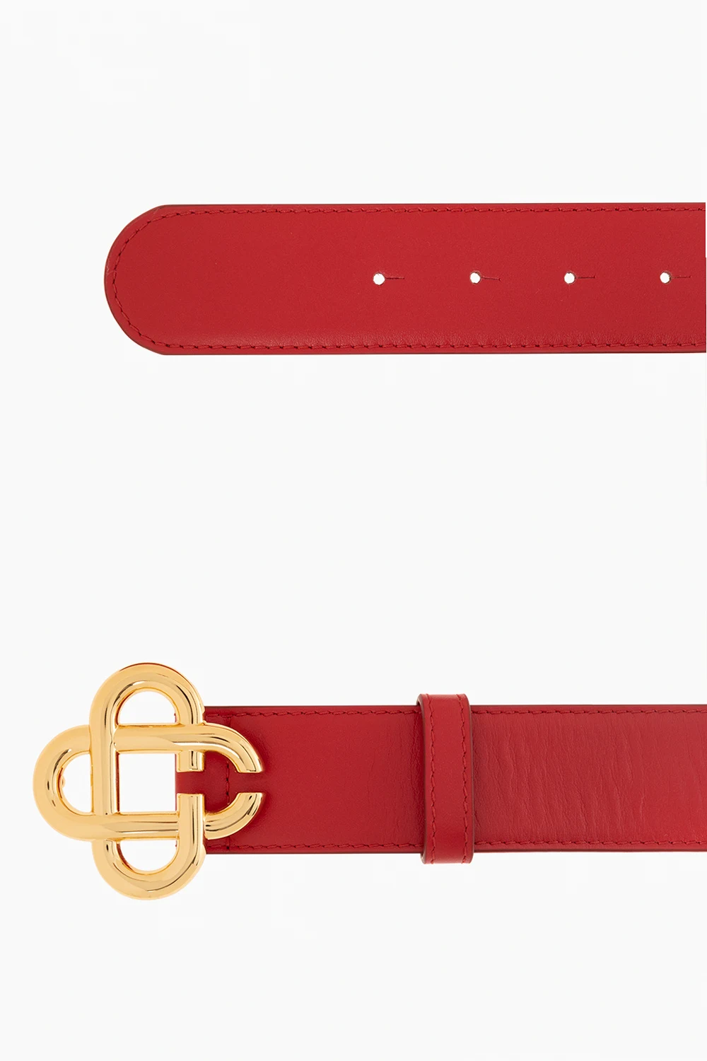 Czerwony pasek Casablanca. Wykonany ze skóry. Mosiężna klamra w kształcie logo w kolorze złotym.