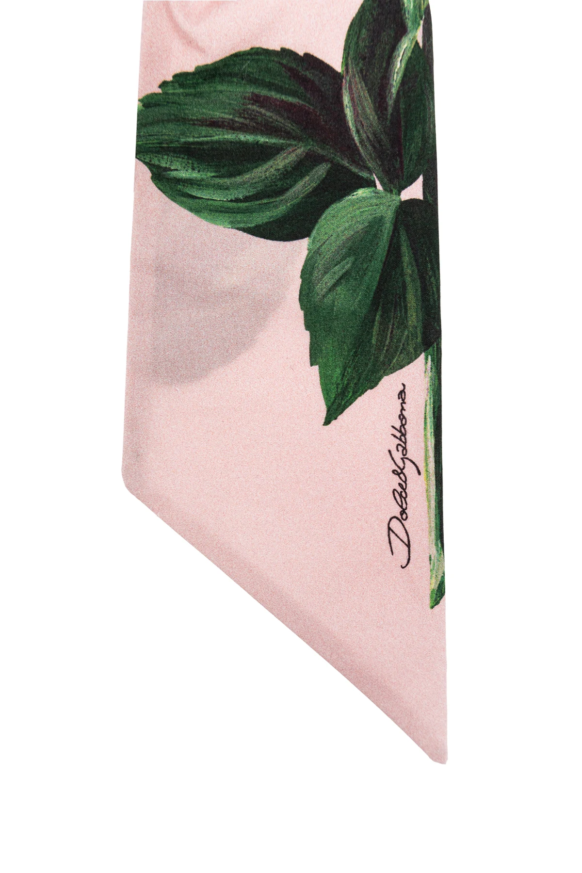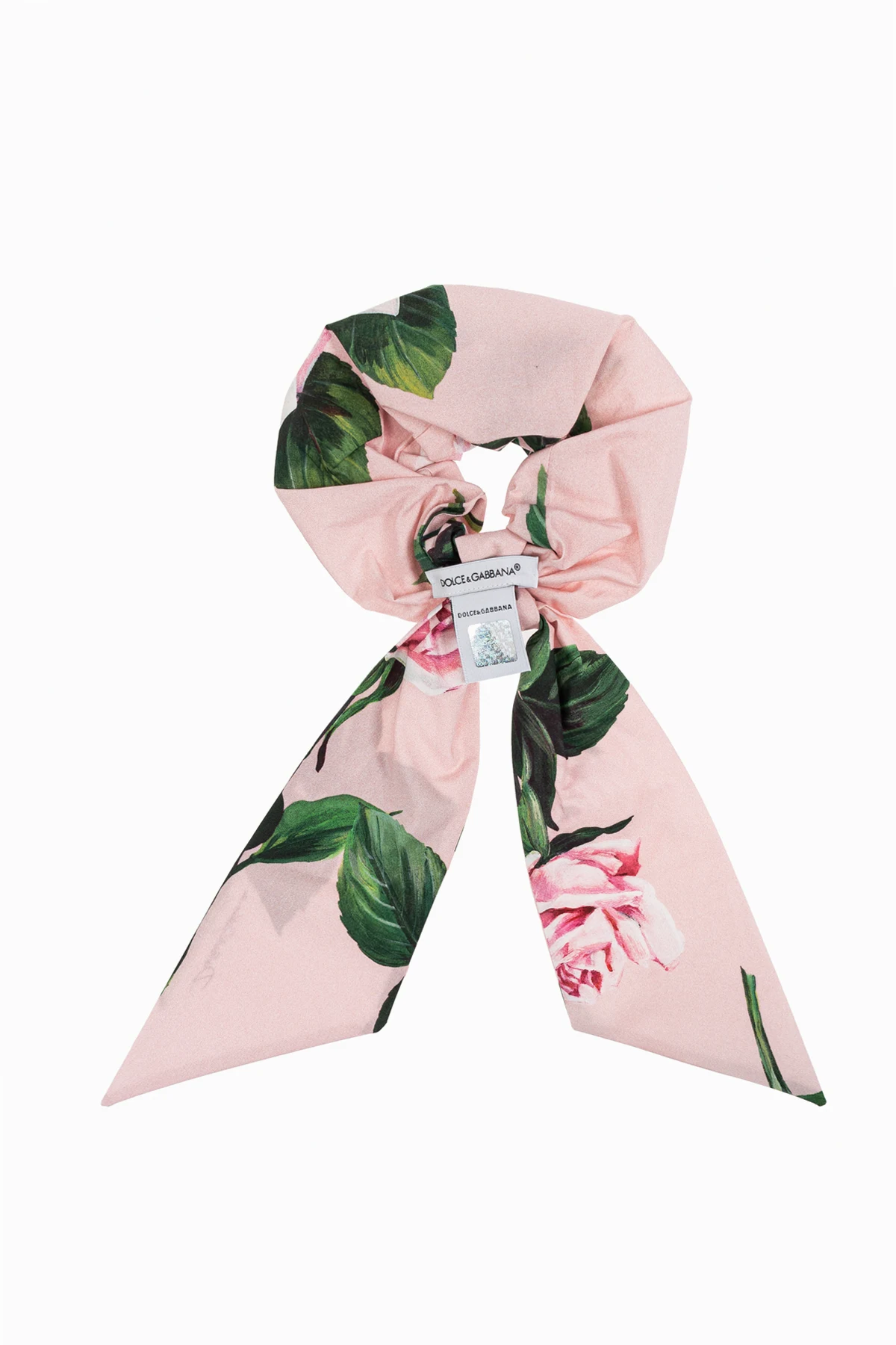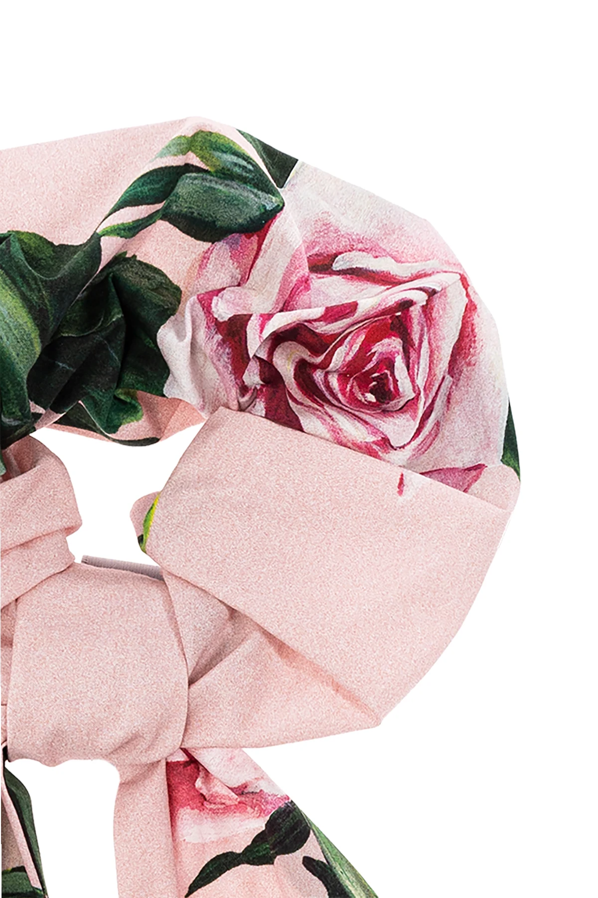 Dominujące różowe tło zdobią realistyczne motywy róż i zielonych liści, nadając jej niezwykle kobiecego charakteru. Materiał, z którego jest wykonana, jest gładki i lekko połyskujący, co świadczy o jego wysokiej jakości i dbałości o każdy detal. Subtelne logo projektanta na jednym z końców oraz staranne wykończenie podkreślają ekskluzywność tej gumki, czyniąc ją idealnym dodatkiem do każdej stylizacji.