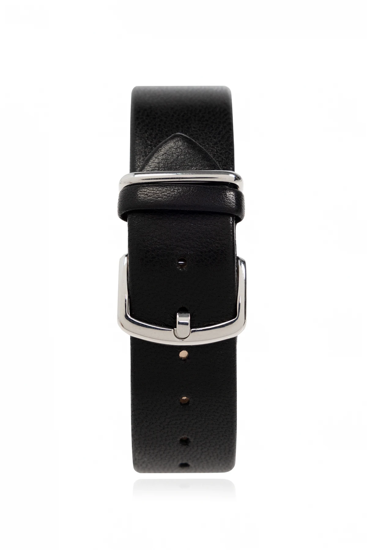 Koperta zegarka z polerowanego srebra dodaje mu nowoczesnego charakteru, natomiast czarny pasek wykonany z najwyższej jakości skóry jagnięcej, zapewniający wygodę noszenia, podkreśla jego elegancki styl. Całość dopełnia klasyczne zapięcie na klamrę, czyniąc zegarek idealnym dodatkiem na formalne okazje.