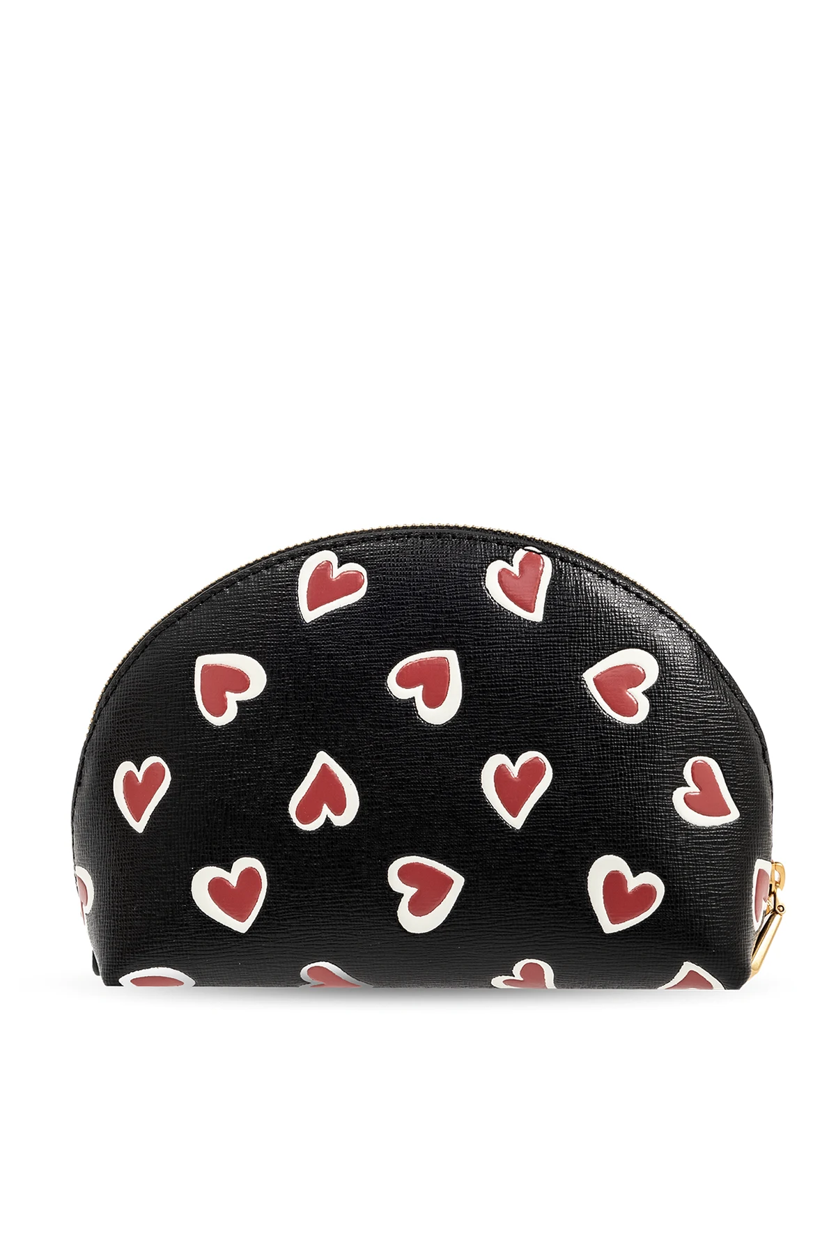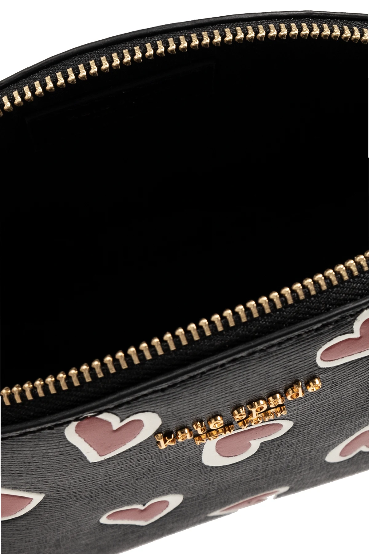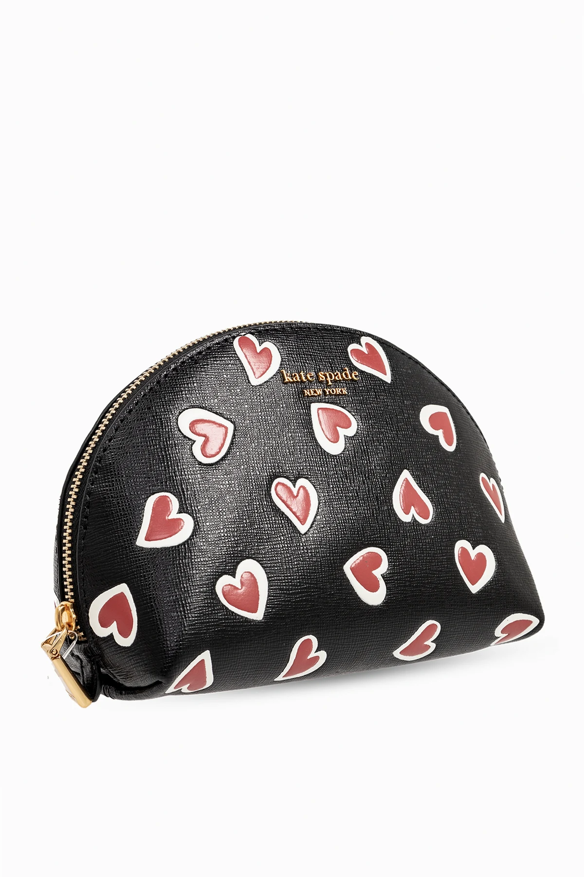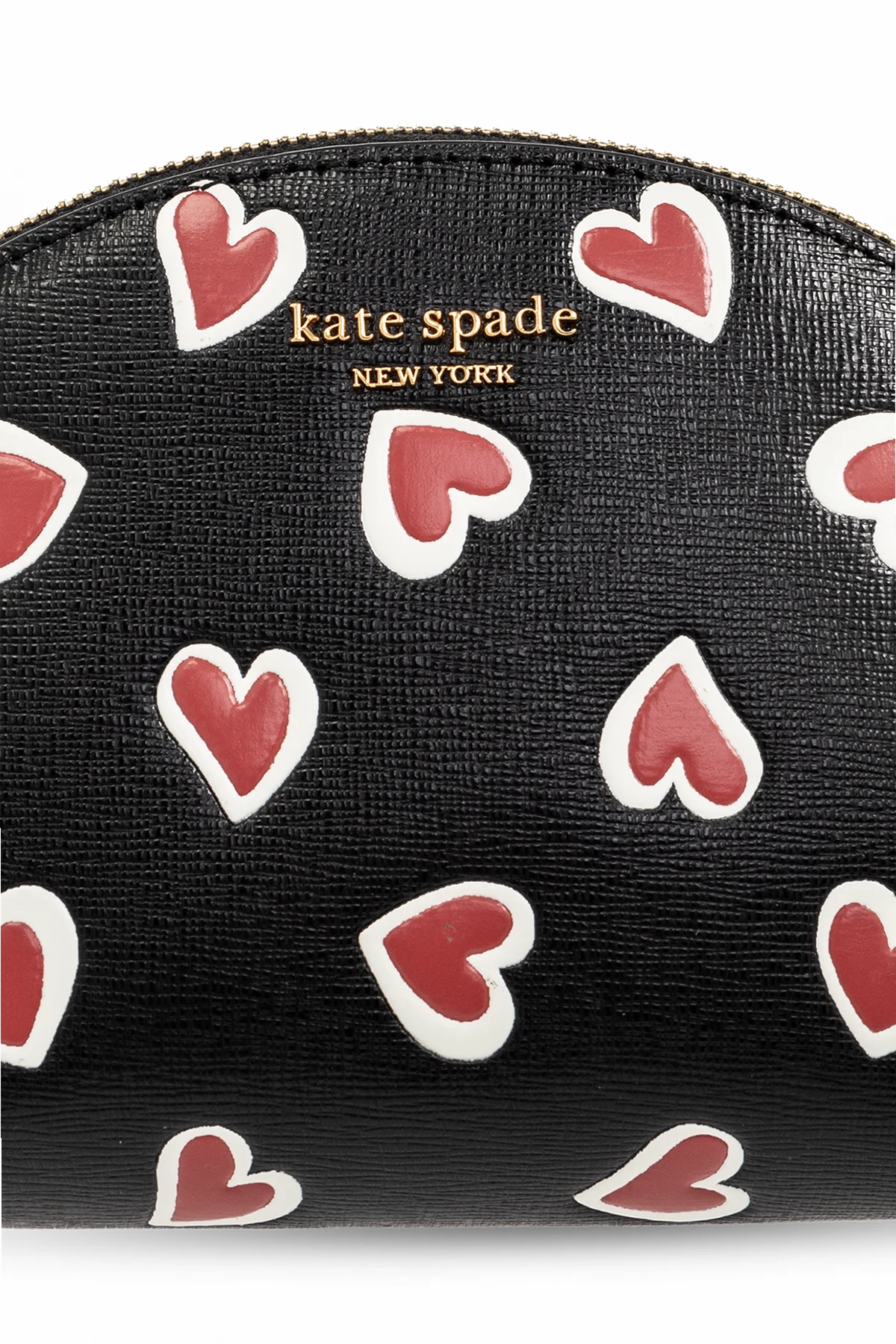 Czarna kosmetyczka Kate Spade. Zamykana na zamek. Ozdobiona czerwono-białym wzorem z motywem serc. Z przodu metalowa aplikacja w kształcie logo. Wewnątrz komora. Metalowe elementy w kolorze złotym.