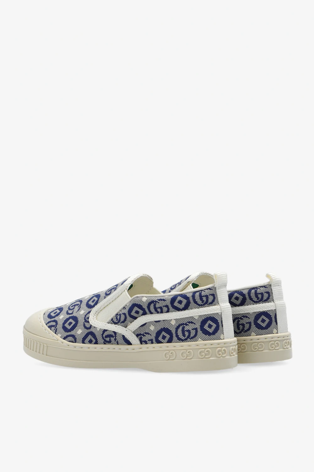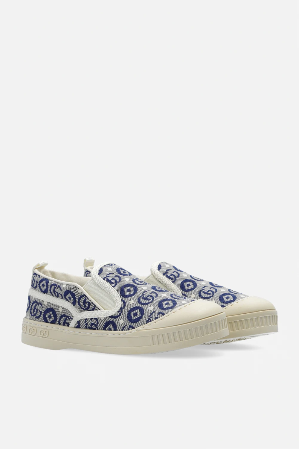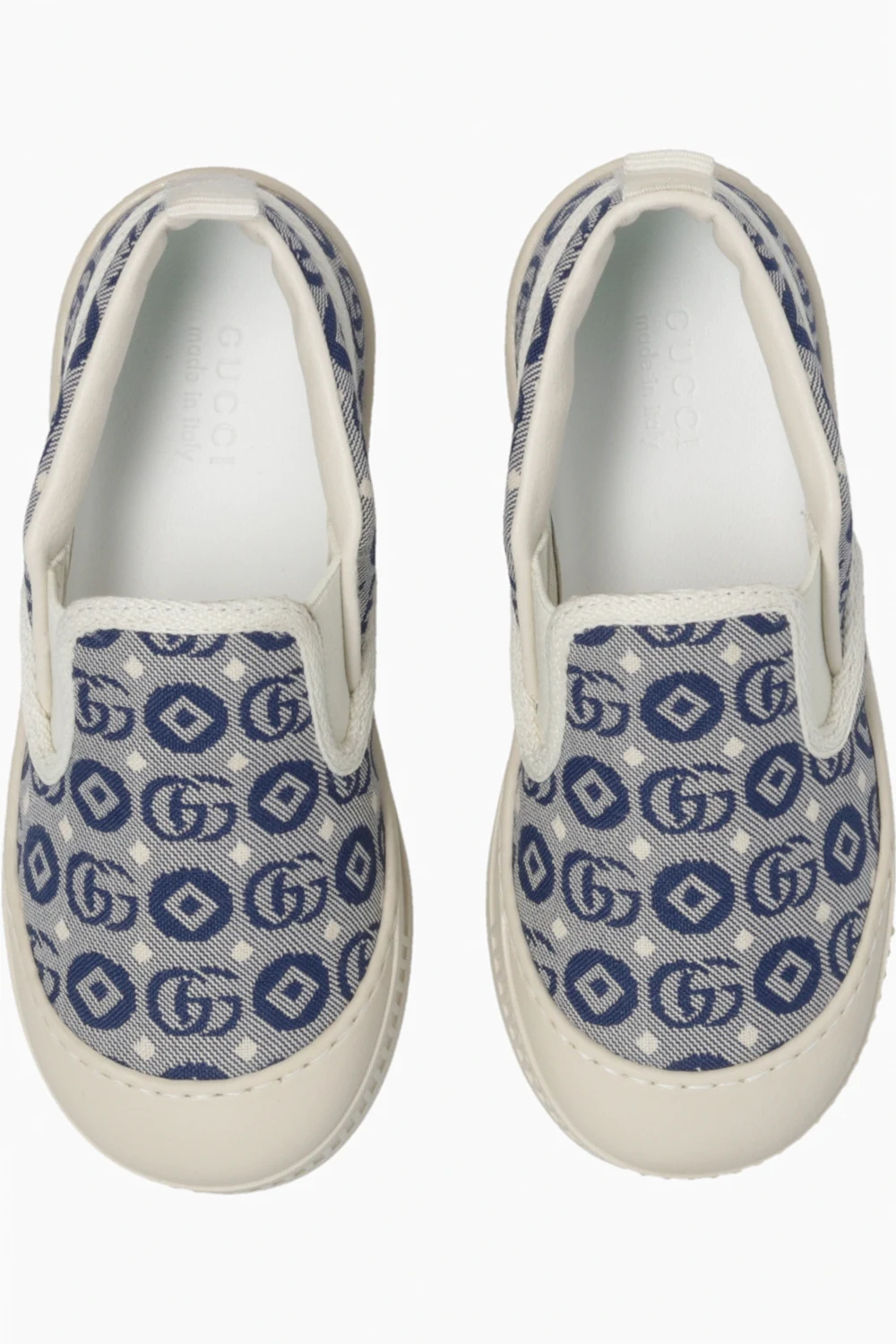 Kremowo-granatowe, wsuwane buty Gucci Kids. Wykonane z materiału. Ozdobione wzorem ‘GG’. Z przodu wszyte taśmy elastyczne. Gumowa wstawka. Kremowa, gumowa podeszwa.