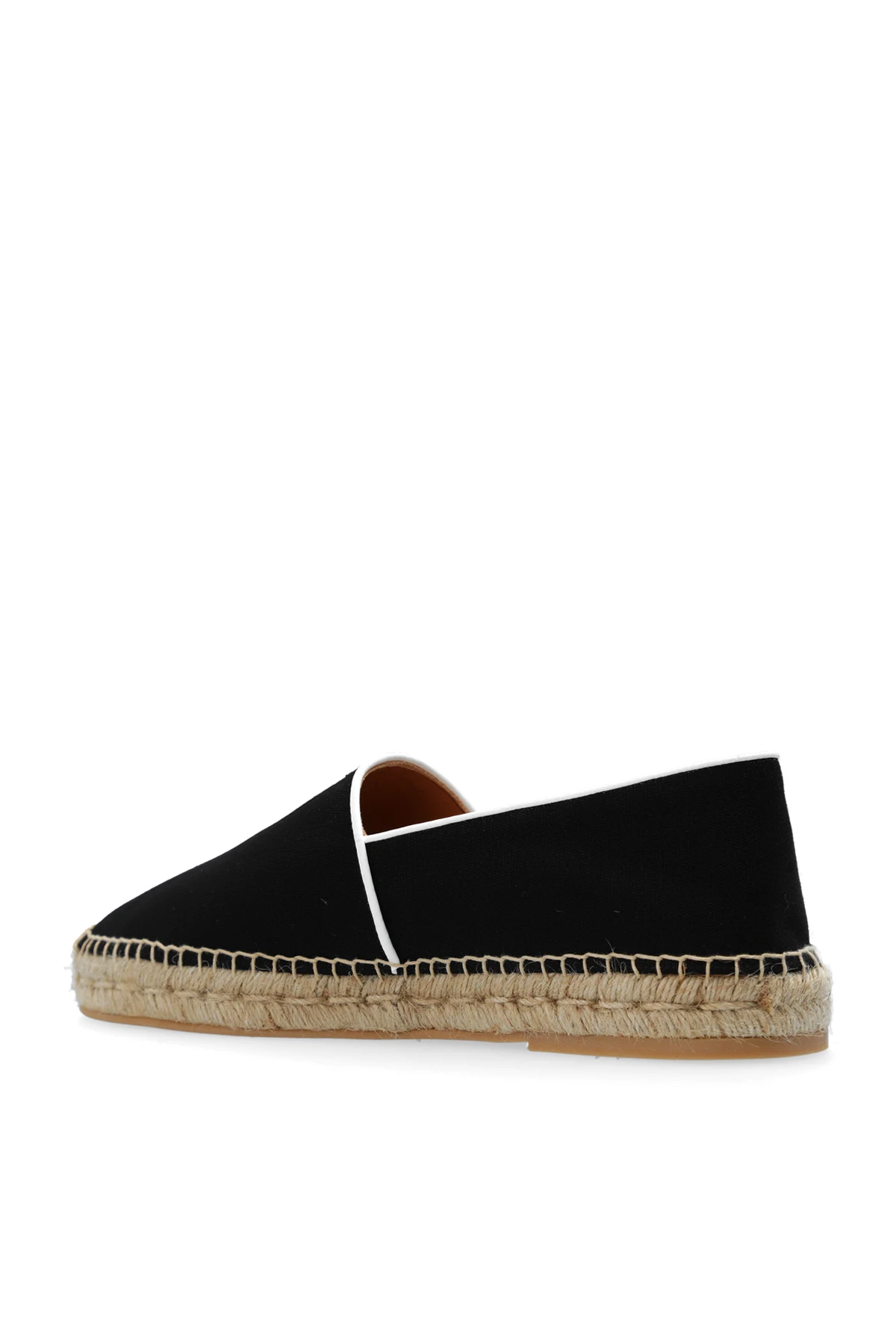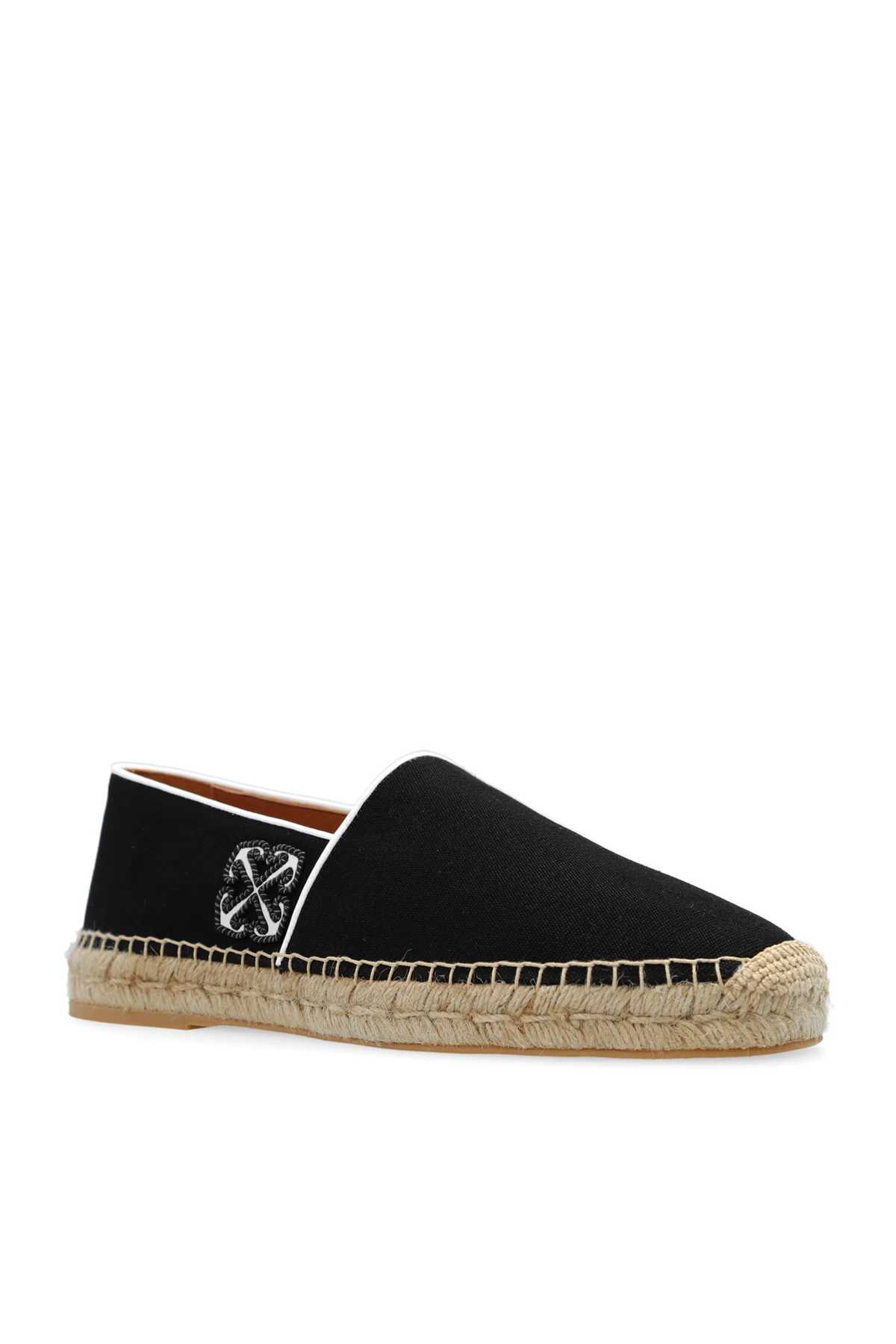Czarne espadryle, model ‘Anglette’ Off-White. Wykonane z bawełny. Z boku ozdobione biało-czarną naszywką w kształcie charakterystycznych strzałek. Beżowa, gumowa podeszwa wykończona jutą.