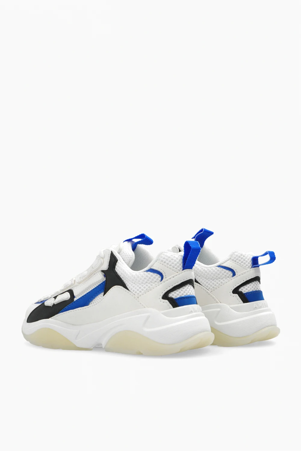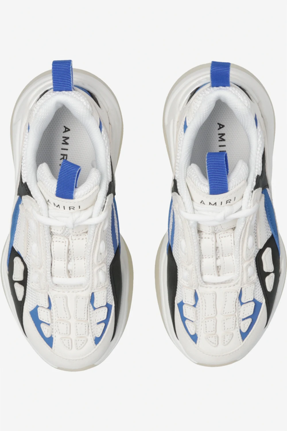 Biało-granatowo-czarne, sznurowane buty sportowe, model ‘Bone’ Amiri Kids. Wykonane ze skóry i materiału. Ozdobione dekoracyjnymi naszywkami. Biało-kremowa, gumowa podeszwa.