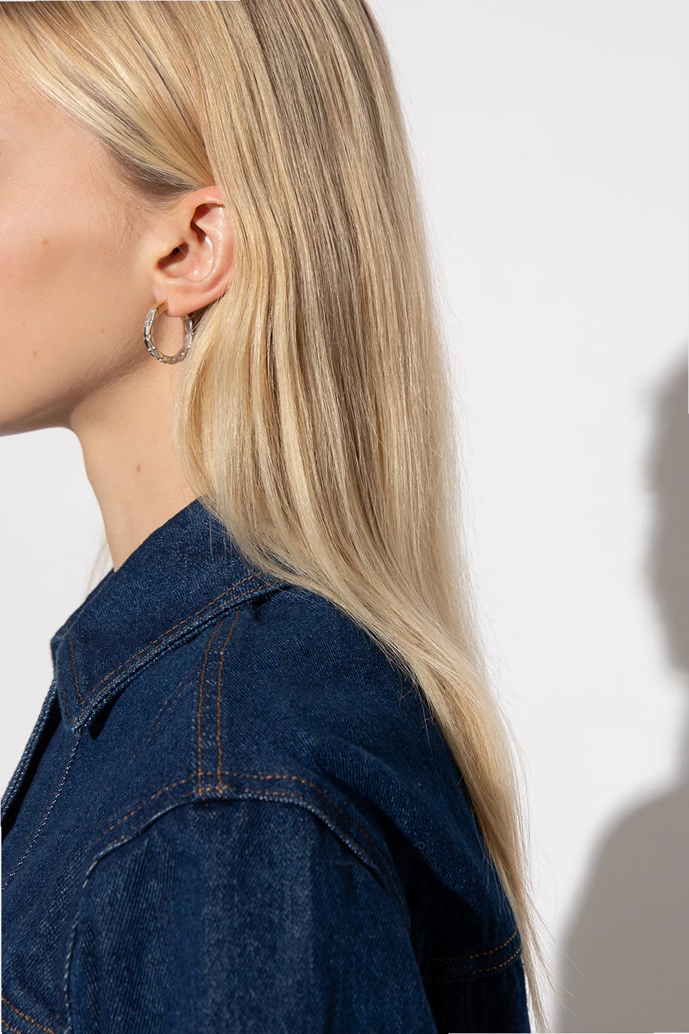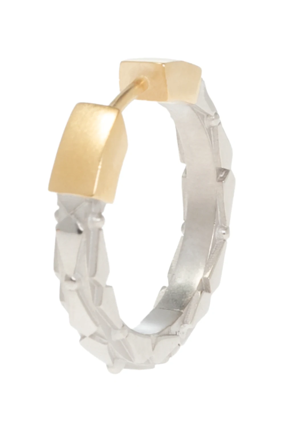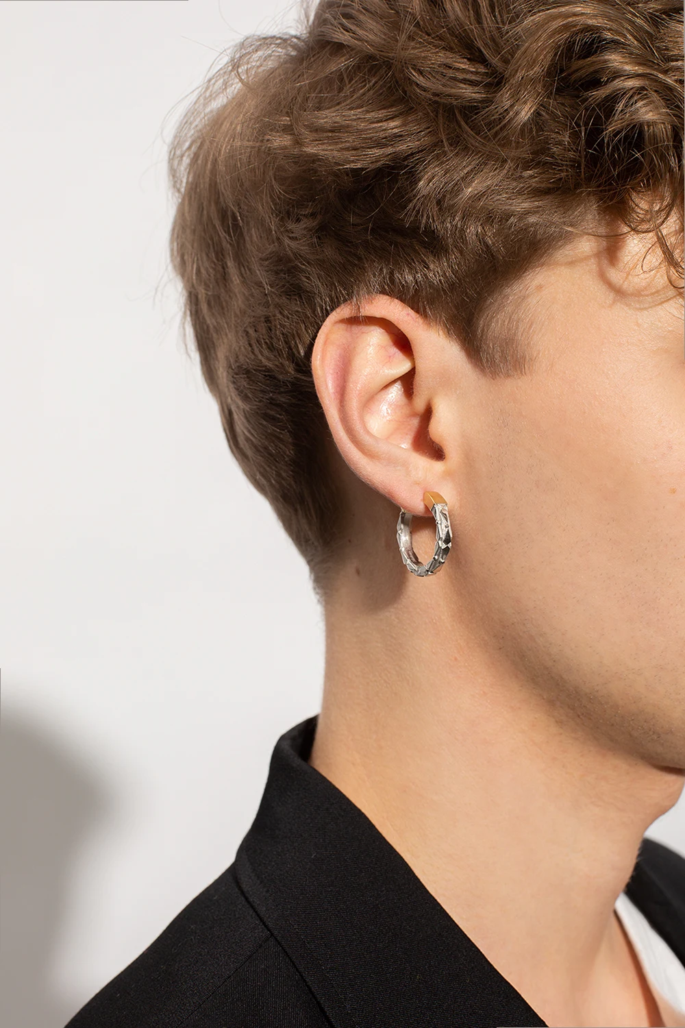 Mosiężny kolczyk w kolorze srebrno-złotym Maison Margiela. Ozdobiony wygrawerowanym logo.
