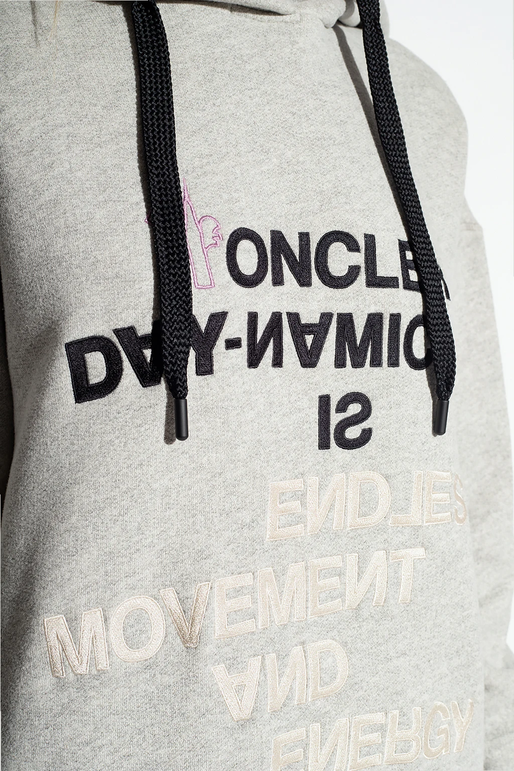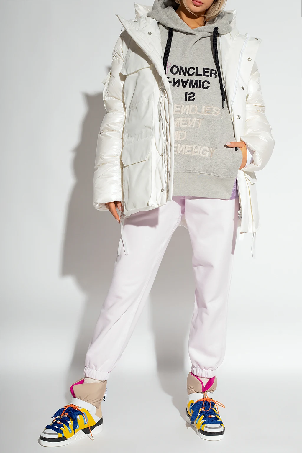 Szaro-kremowo-fioletowa bluza o luźnym kroju Moncler Grenoble. Wykonana z łączonych materiałów. Kaptur ściągany trokami. Ozdobiona wyszytym napisem z logo. Z przodu dwie kieszenie zapinane na zatrzask. Długie rękawy i dół bluzy zakończone ściągaczem.