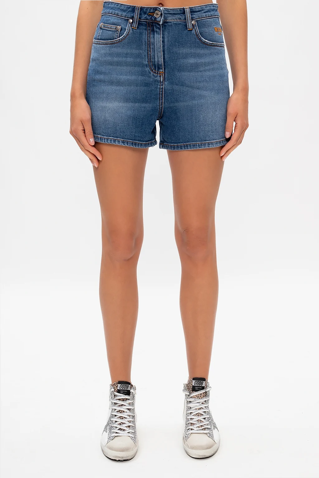 Niebieskie, jeansowe szorty MSGM. Zapinane na zamek i guzik. Z przodu wyszyte beżowe logo. Pięć kieszeni: trzy z przodu i dwie wsuwane z tyłu, na jednej logo ułożone z cekinów w kolorze srebrnym.