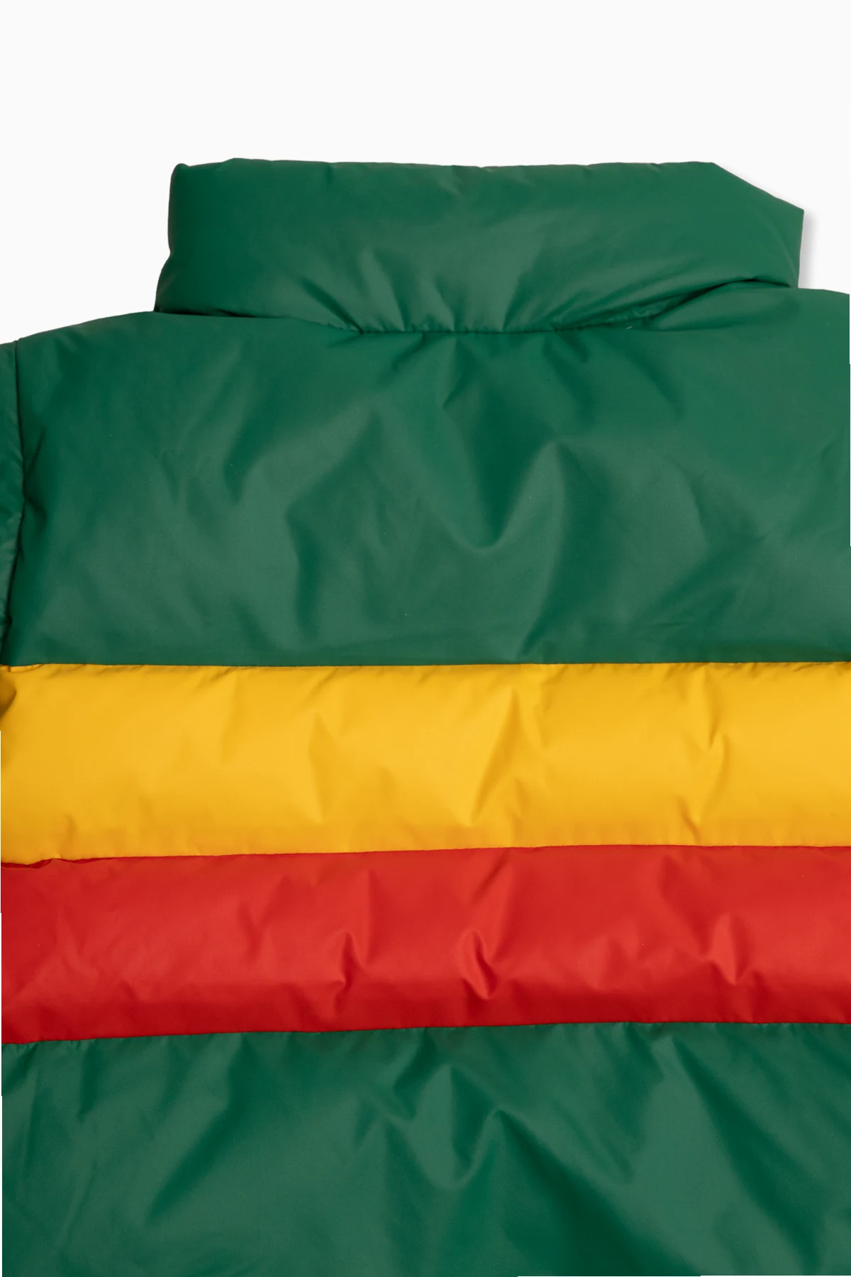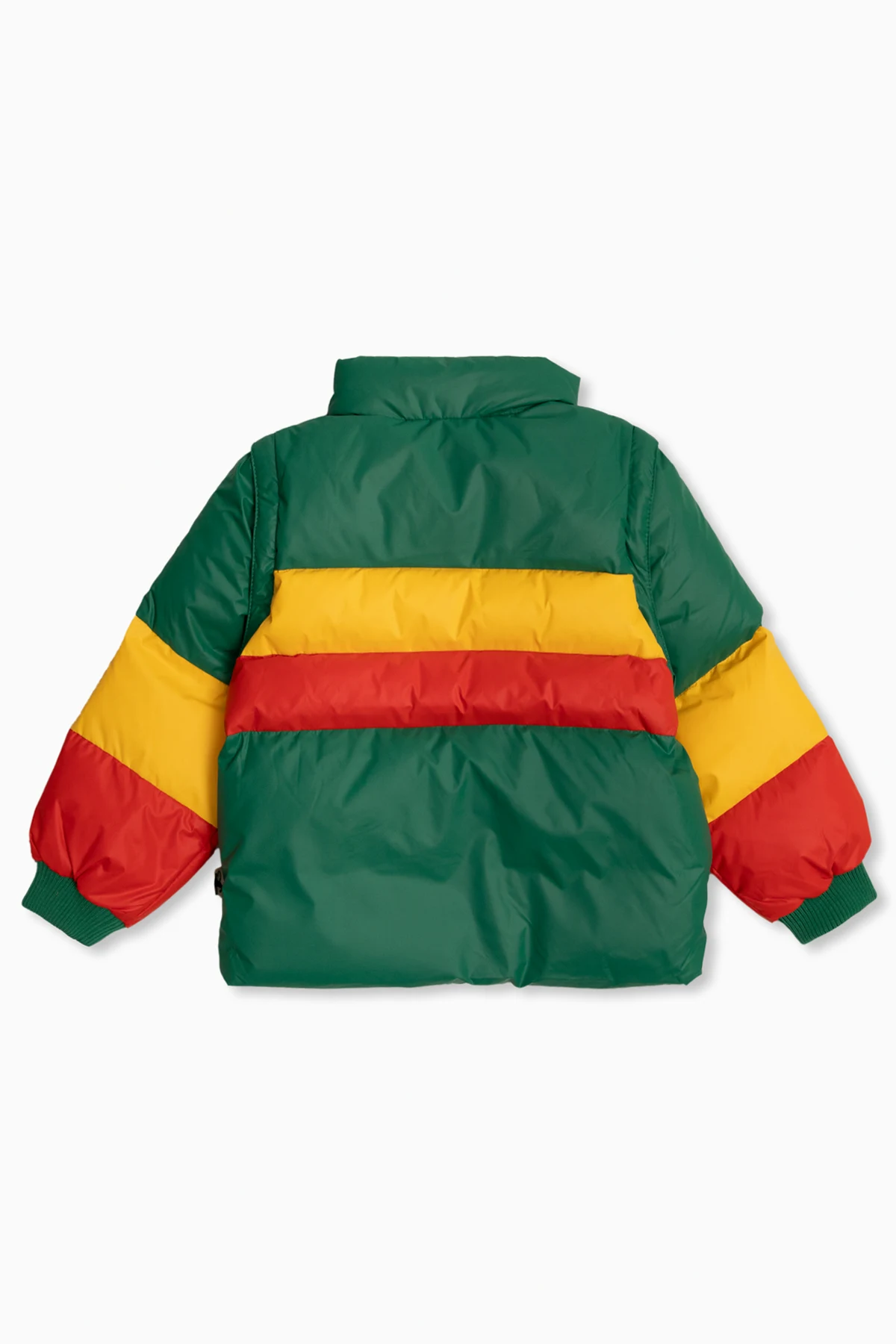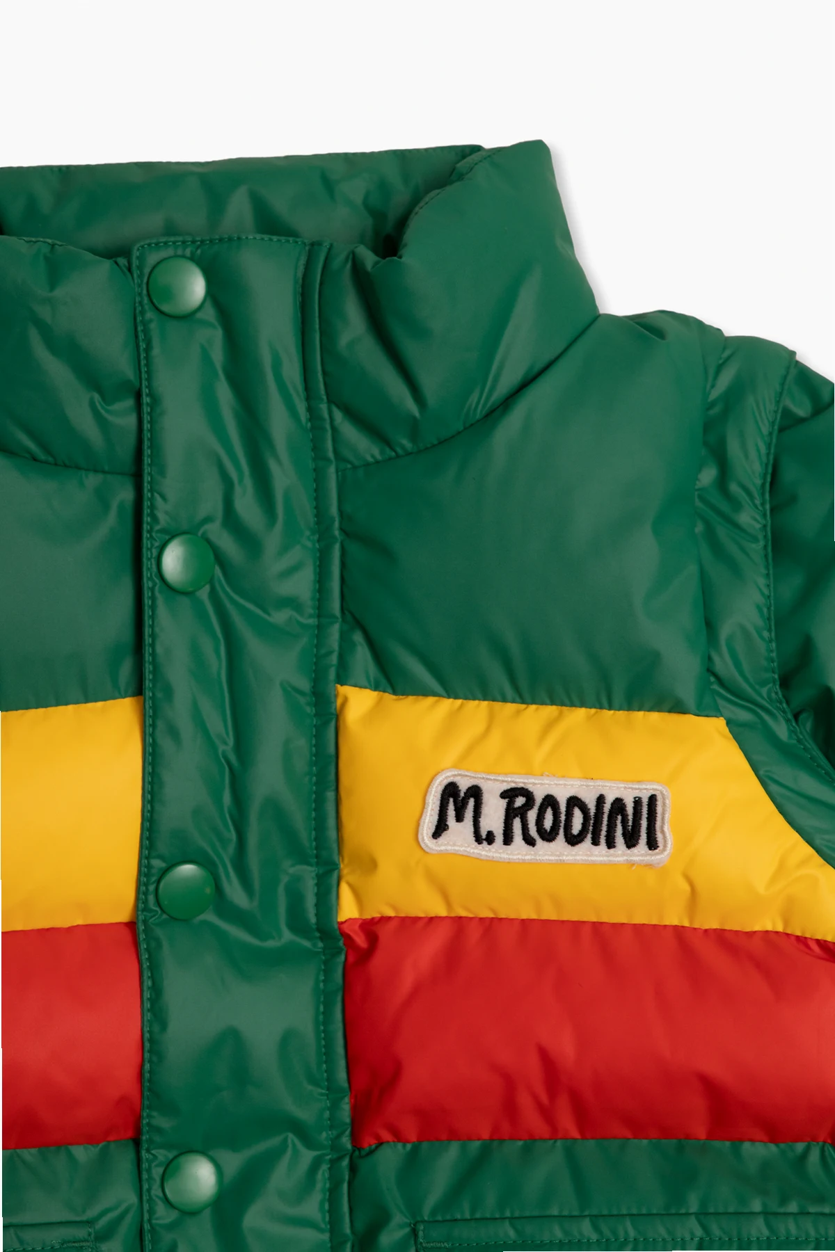 Zielono-żółto-czerwona, ocieplana kurtka Mini Rodini. Wykonana z wodoodpornego i wiatroszczelnego materiału z recyklingu. Zapinana na zamek i zatrzaski. Z przodu naszywka z logo. Dwie kieszenie z patką zapinaną na zatrzask. Długie, odpinane rękawy zakończone ściągaczem.
