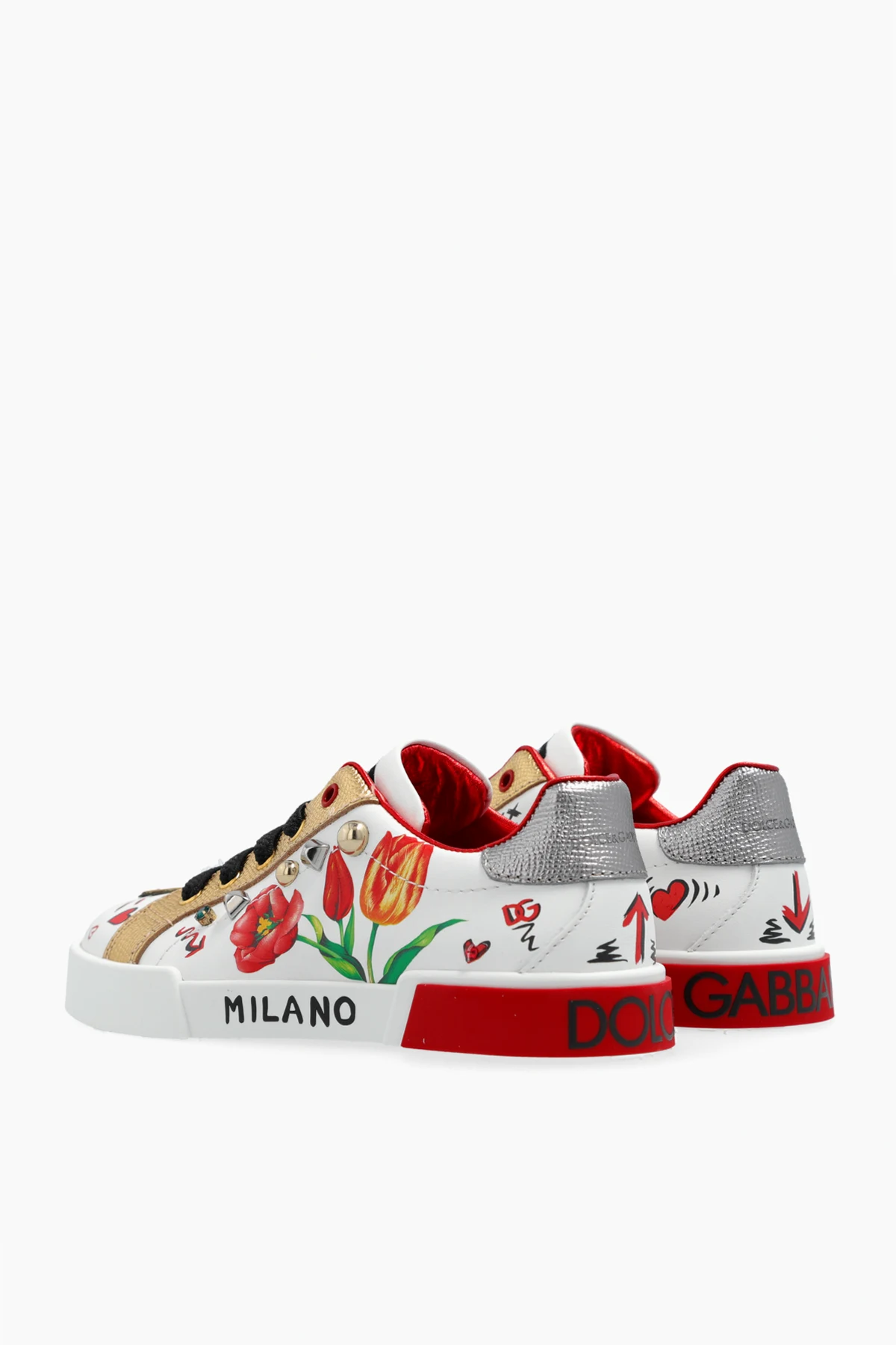 Wierzchnia część butów wykonana z białej skóry, zdobiona jest kolorowymi nadrukami z motywami kwiatowymi, sercami oraz innymi graficznymi elementami. Złote i srebrne detale dodają im elegancji i nowoczesności, a kontrastowe czarne sznurówki tworzą harmonijną całość.