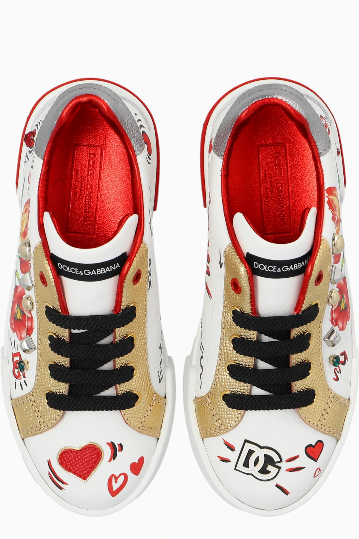 Buty przyciągają wzrok napisami "ITALY" na boku podeszwy oraz "MILANO" z tyłu buta, podkreślając włoskie pochodzenie marki. Logo "DOLCE & GABBANA" na językach i wkładkach oraz litery "DG" na przodzie jednego z butów świadczą o ich ekskluzywności.