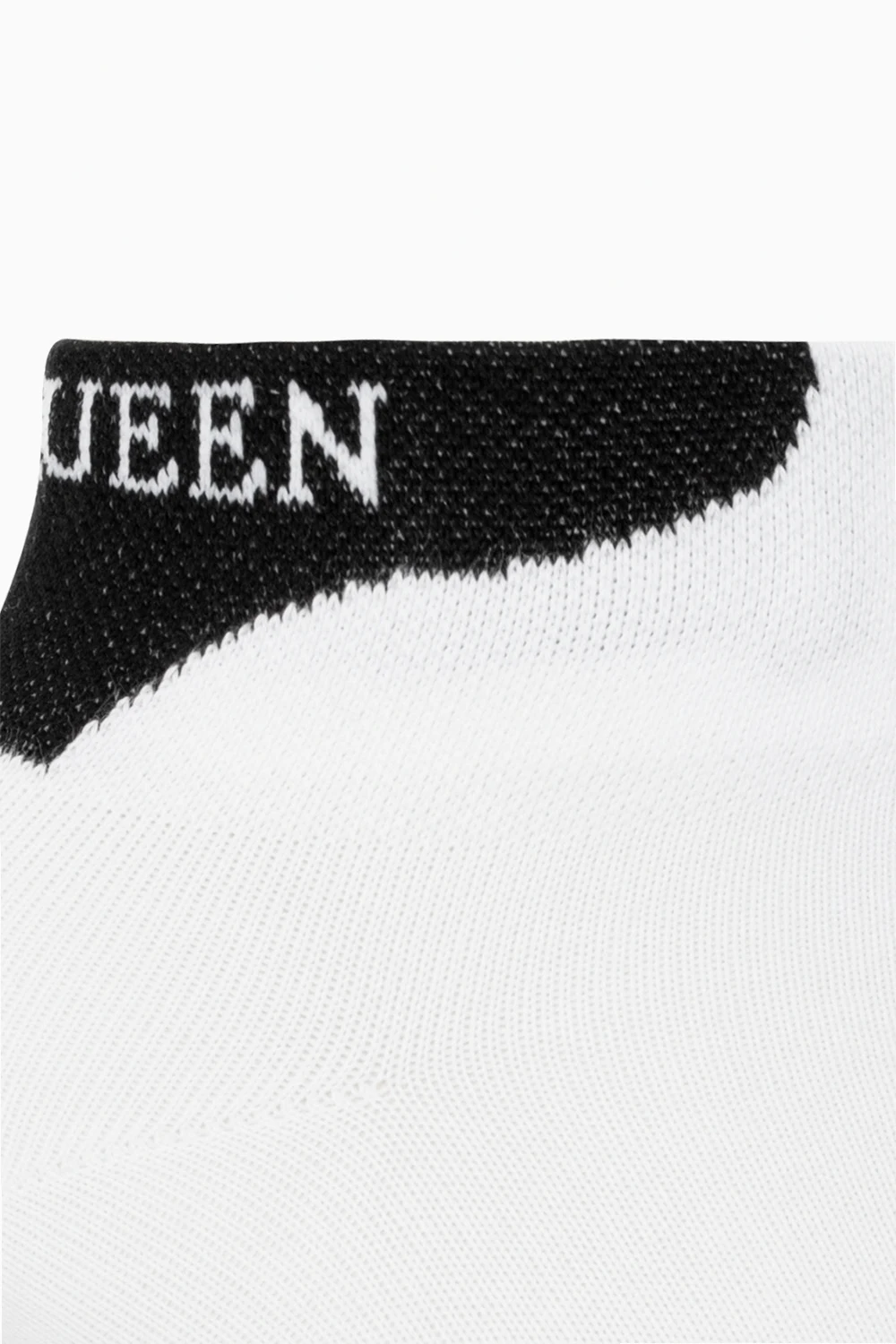 Biało-czarne skarpety Alexander McQueen. Wykonane z bawełny. Ozdobione wzorem z logo. Wykończone ściągaczem.