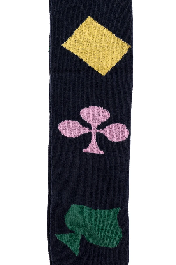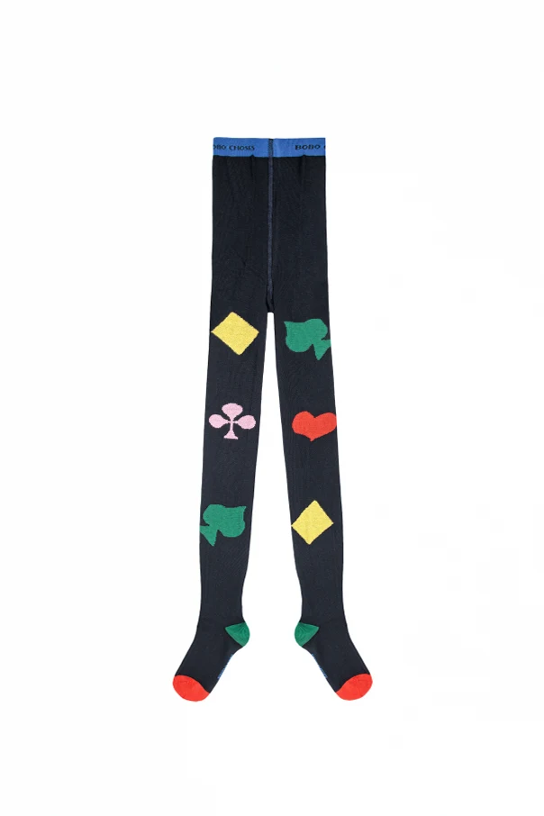 Uwagę przyciąga niepowtarzalny motyw kolorowych figur inspirowanych kartami do gry – wyraziste czerwone serca, zielone pik, żółte karo oraz różowe trefle nadają rajstopom oryginalny i ponadczasowy charakter. Kontrastowe akcenty, takie jak zielone pięty i czerwone czubki stóp, podkreślają indywidualność produktu. O jakości świadczy również powtarzający się napis „BOBO CHOSES” na niebieskim ściągaczu w pasie.