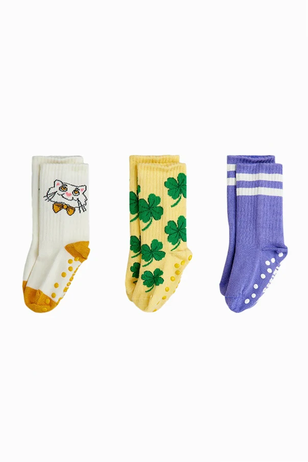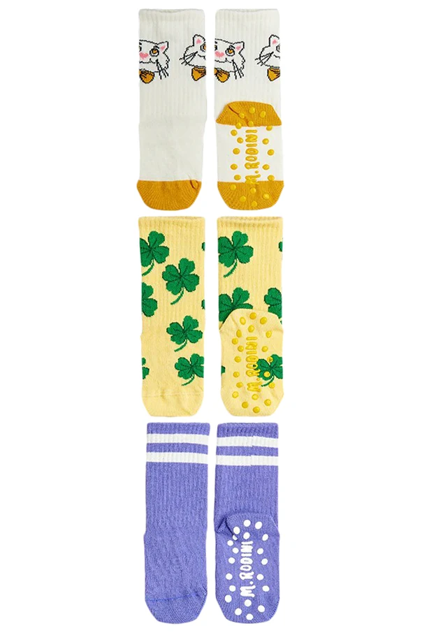 Trójpak skarpet Mini Rodini to wyraziste połączenie szlachetnej dzianiny bawełnianej z nutą kreatywności, stworzone z myślą o najmłodszych miłośnikach unikatowego stylu. Każda para zaskakuje bogactwem kolorów i niepowtarzalnym wzornictwem: subtelne ecru z głową kota, słoneczne żółcie z motywem koniczynek oraz fiolet z harmonijnymi akcentami bieli.