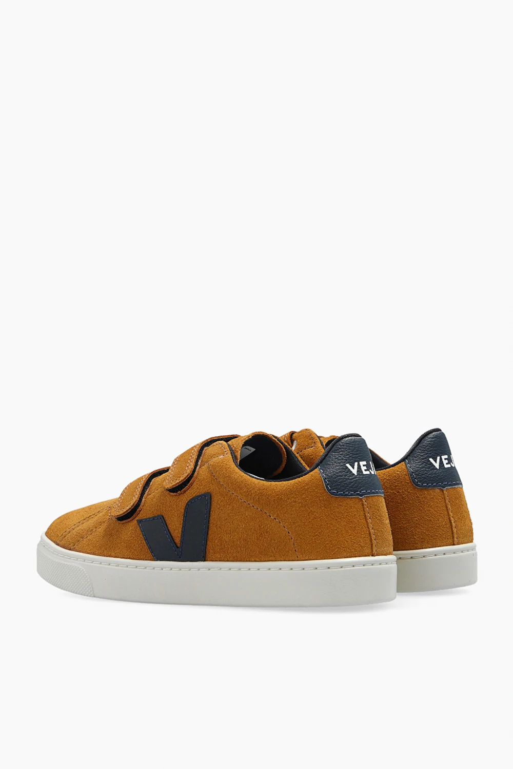 Brązowe buty, model ‘Esplar’ Veja Kids. Wykonane z zamszu bez użycia chromu. Zapinane na podwójny rzep. Na języku wytłoczone logo. Charakterystyczna dla marki naszywka wykonana z odpadów ryżowych. Skórzany zapiętek w kolorze granatowym. Warstwa wewnętrzna o specjalnej, siateczkowej strukturze wykonana z materiału pochodzącego z recyklingu- zapewniająca wyjątkową odporność na tarcie. Wkładka wykonana z trzciny cukrowej, gumy Amazon, bawełny organicznej i pochodzącej z recyklingu pianki EVA. Kremowa, gumowa podeszwa wykonana z materiałów organicznych oraz pochodzących z recyklingu.