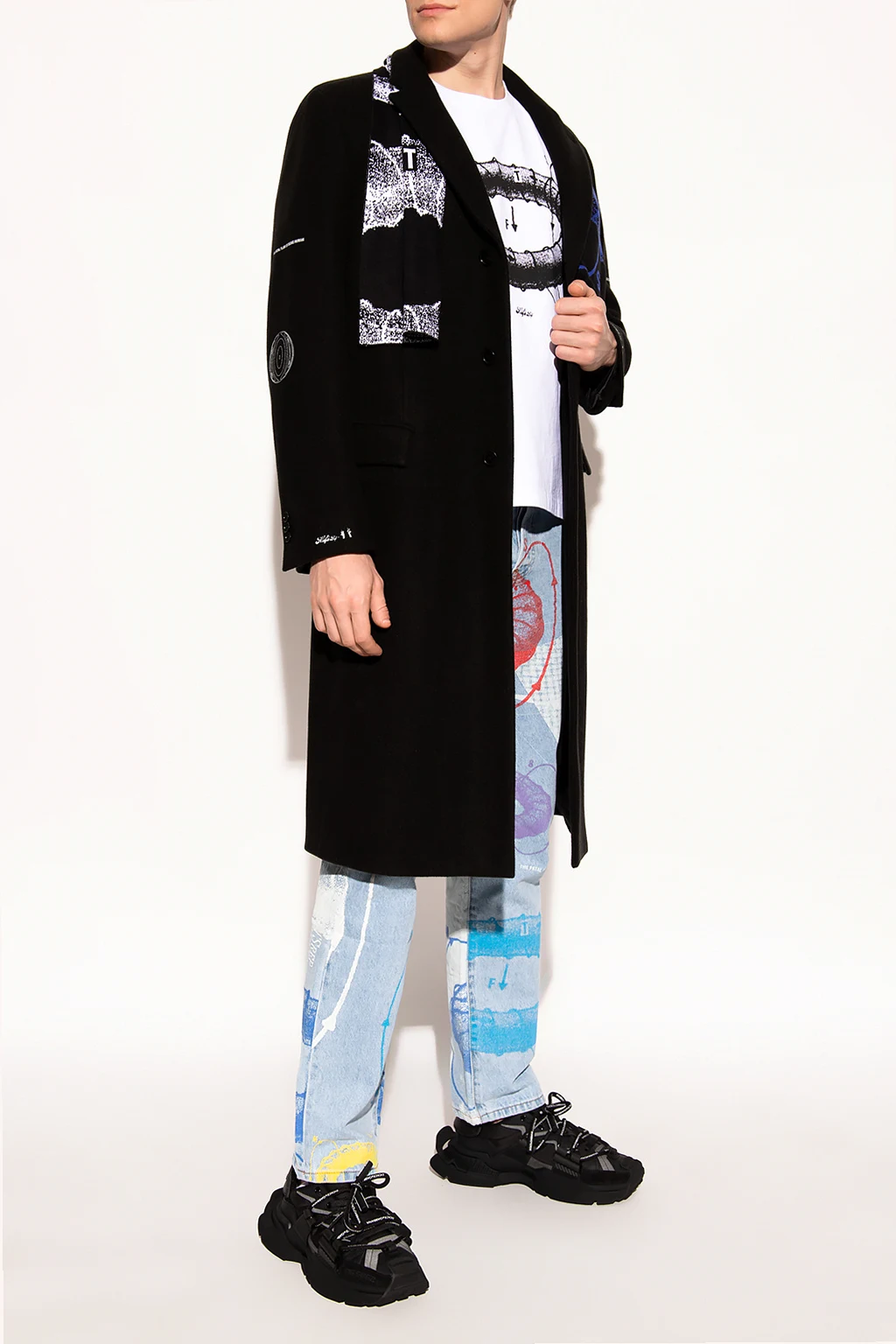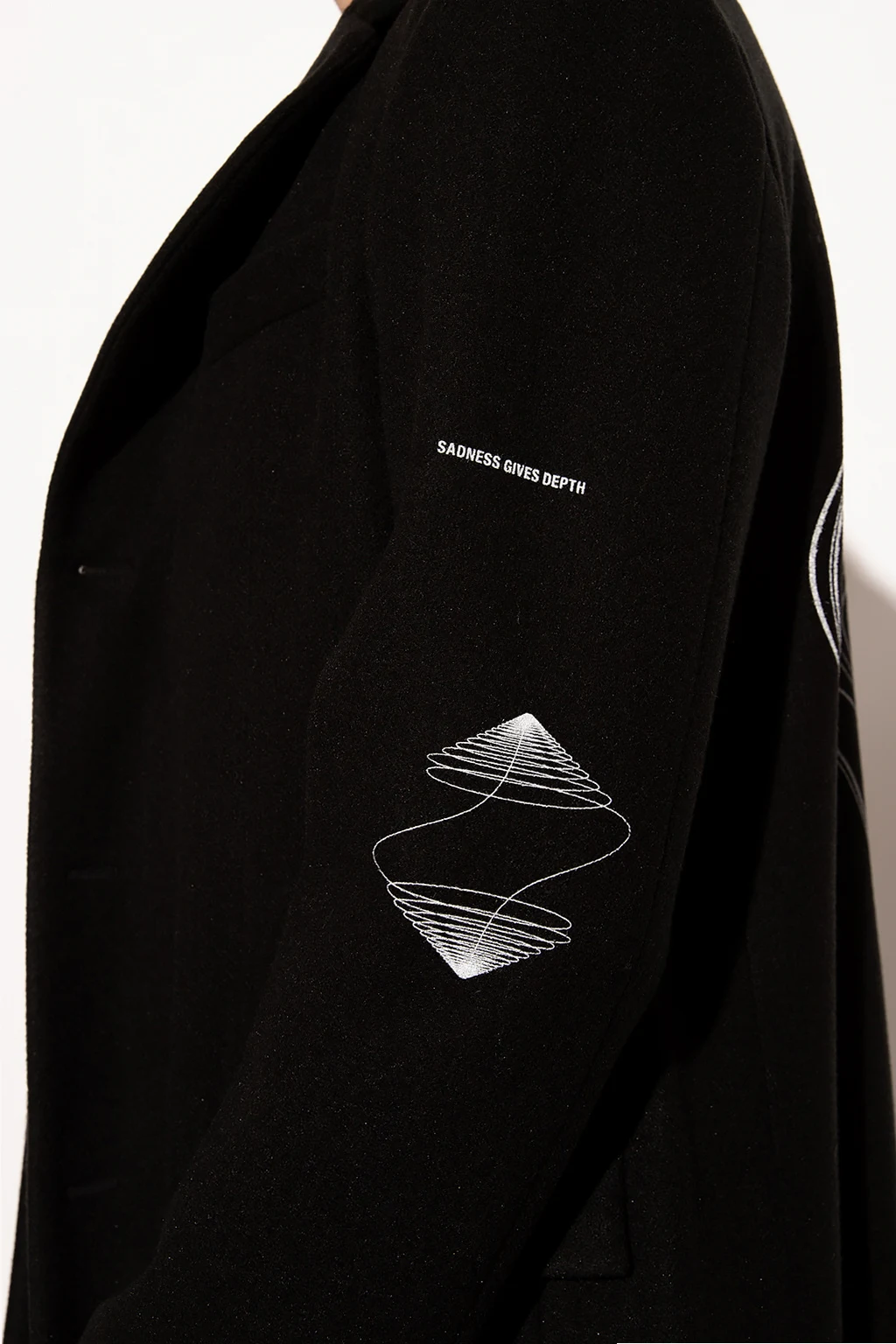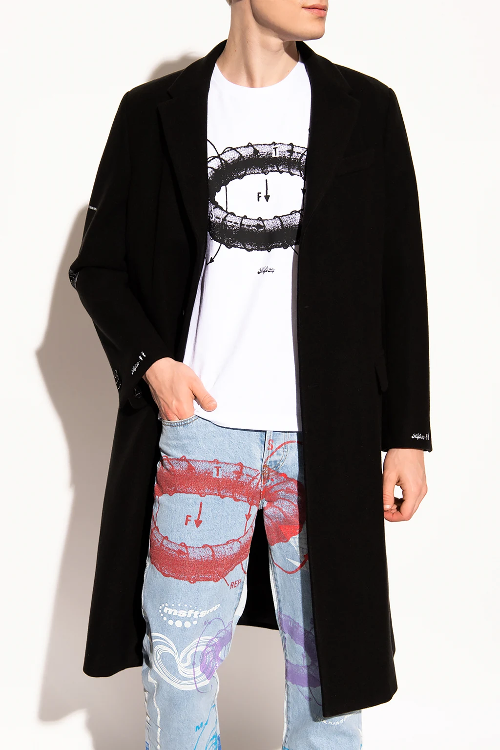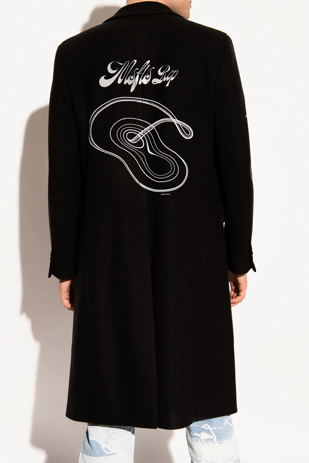Czarny płaszcz MSFTSREP. Wykończony wełną. Zapinany na guziki. Z tyłu oraz na rękawach ozdobiony nadrukami z logo w kolorze białym. Trzy kieszenie: dwie z patką, jedna wsuwana. Długie rękawy zakończone zapięciem na guziki.