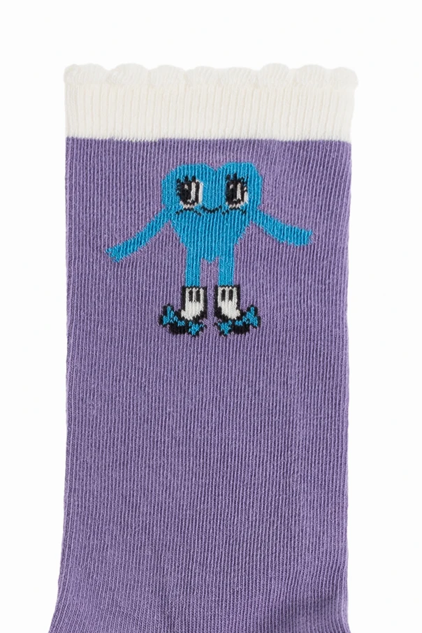 Multikolorowa prezentacja zachwyca oryginalnymi detalami: kremowa para z pomarańczowym, falowanym ściągaczem oraz fioletowa z białym wykończeniem. Obie skarpetki zdobi haftowana, barwna postać z dużymi oczami i rolkami na stopach, co podkreśla niezwykłą swobodę i dziecięcą wyobraźnię, która jest esencją projektów Mini Rodini. Dekoracyjny, falowany ściągacz dodaje każdej parze lekkości i finezji.